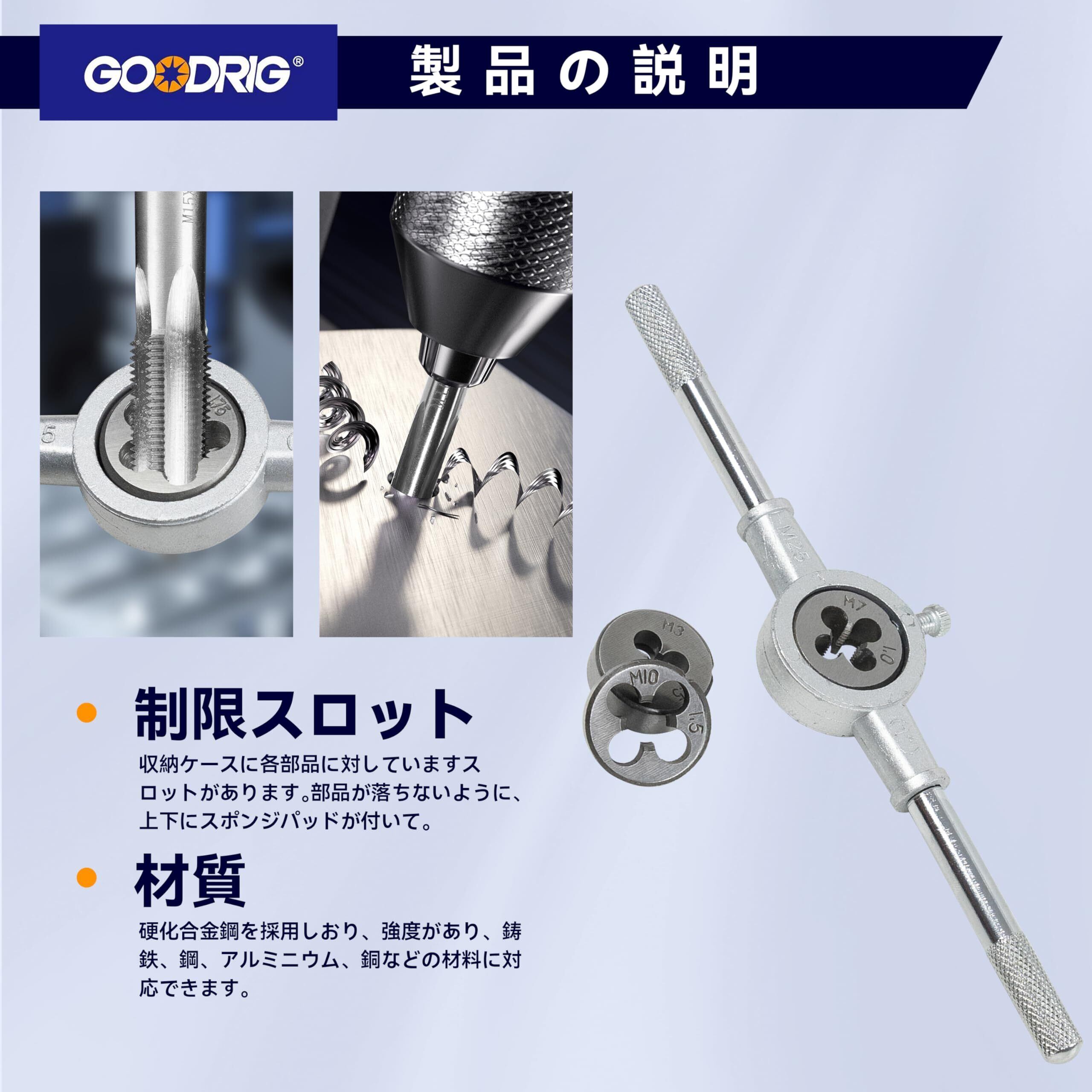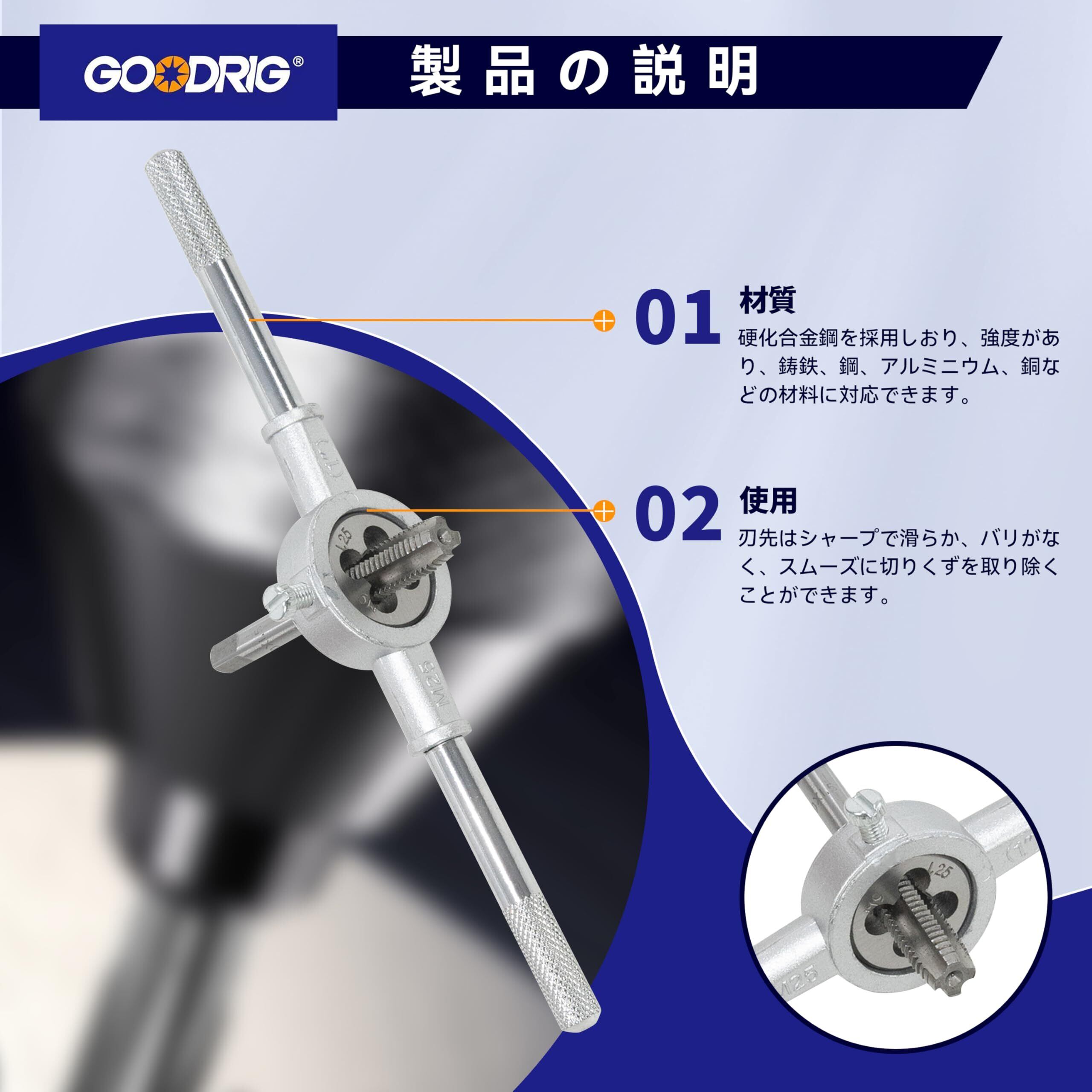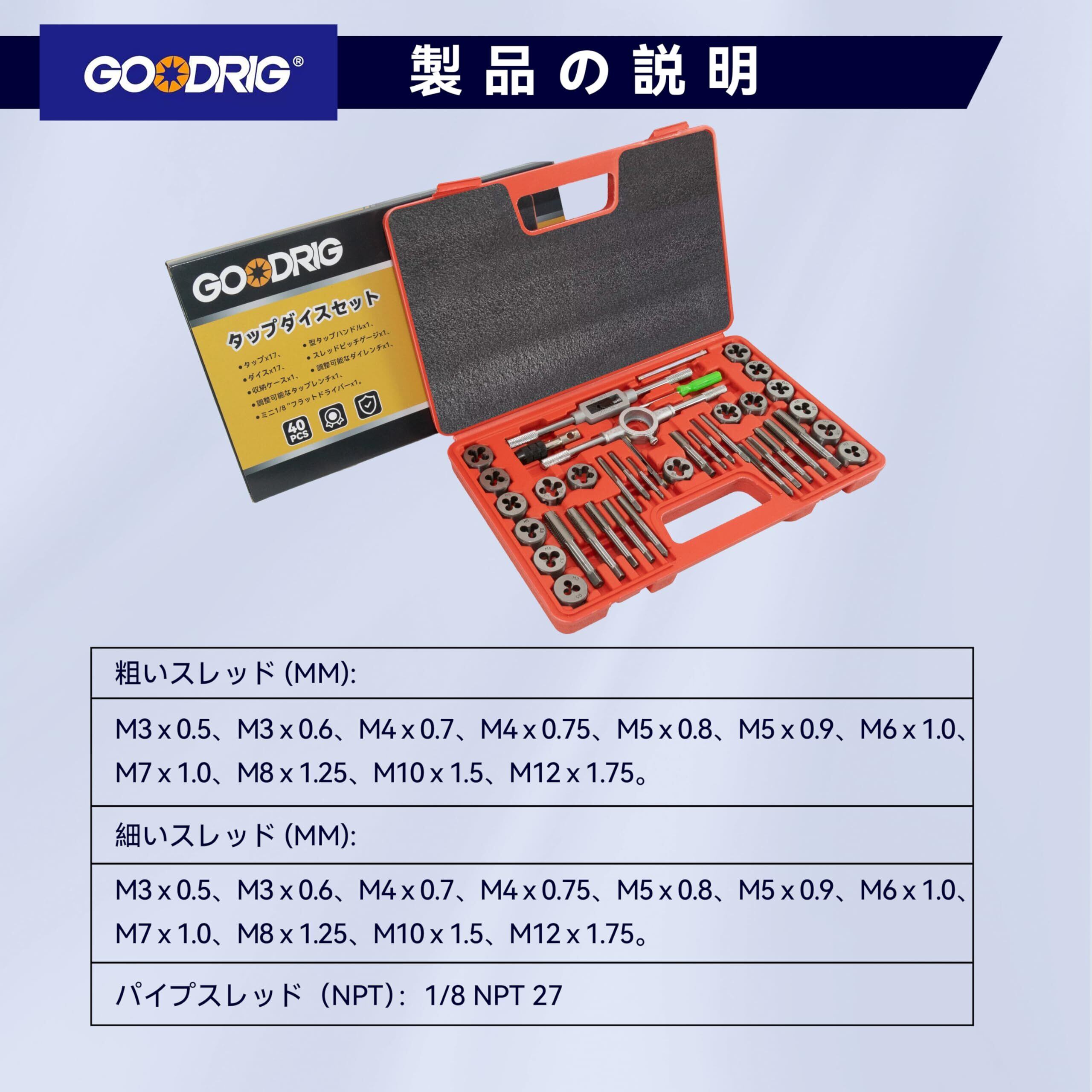 【タップとダイのサイズ】:粗いスレッド(mm):3 x 0.5、3 x 0.6、4 x 0.7、4 x 0.75、5 x 0.8、5 x 0.9、6 x 1.0、7 x 1.0、8 x 1.25、10 x 1.5、12 x 1.75; 細いスレッド(mm):6 x 0.75、7 x 0.75、8 x 1.0、10 x 1.25、12 x 1.5; パイプスレッド(NPT):1/8 NPT 27;"