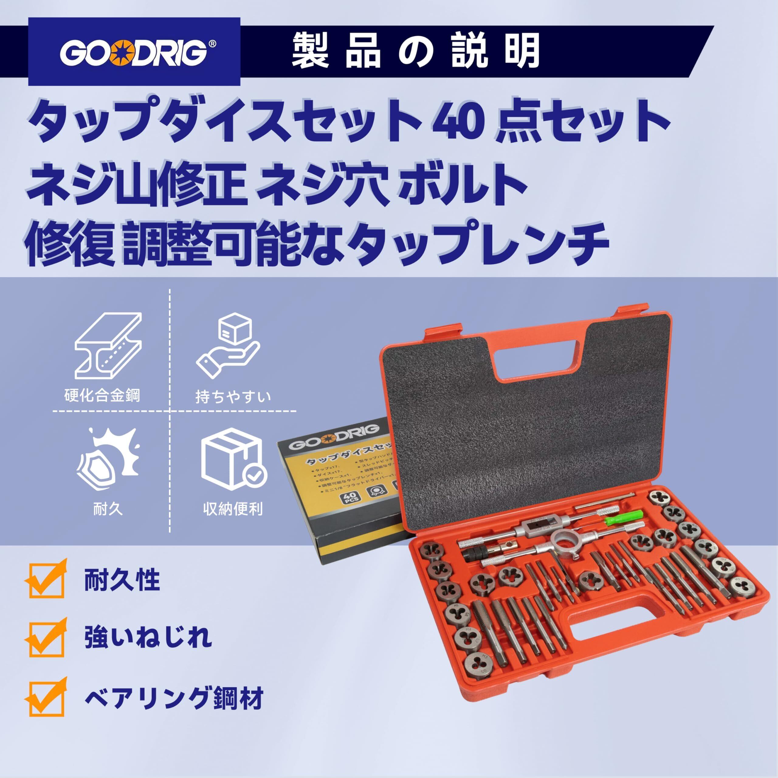 【タップとダイのサイズ】:粗いスレッド(mm):3 x 0.5、3 x 0.6、4 x 0.7、4 x 0.75、5 x 0.8、5 x 0.9、6 x 1.0、7 x 1.0、8 x 1.25、10 x 1.5、12 x 1.75; 細いスレッド(mm):6 x 0.75、7 x 0.75、8 x 1.0、10 x 1.25、12 x 1.5; パイプスレッド(NPT):1/8 NPT 27;" 【材質】:高級タングステン合金鋼を採用しおり、強度があり、鋳鉄、鋼、アルミニウム、銅などの材料に対応できます。 【用途】:このセットは、ナット、ボルト、ねじ山修正に役立ちます。交換用のボルトがなかなか見つからない場合は、このねじ山タップセットを使用してねじ山の修復をしてください。 【40PCパッケージ】:タップx17、ダイスx17、調整可能なタップレンチx1、T型タップハンドルx1、調整可能なダイレンチx1、ミニ1/8 "フラットドライバーx1、スレッドピッチゲージx1、収納ケースx1。 【制限スロット】:収納ケースに各部品に対していますスロットがあります。部品が落ちないように、上下にスポンジパッドが付いて。
