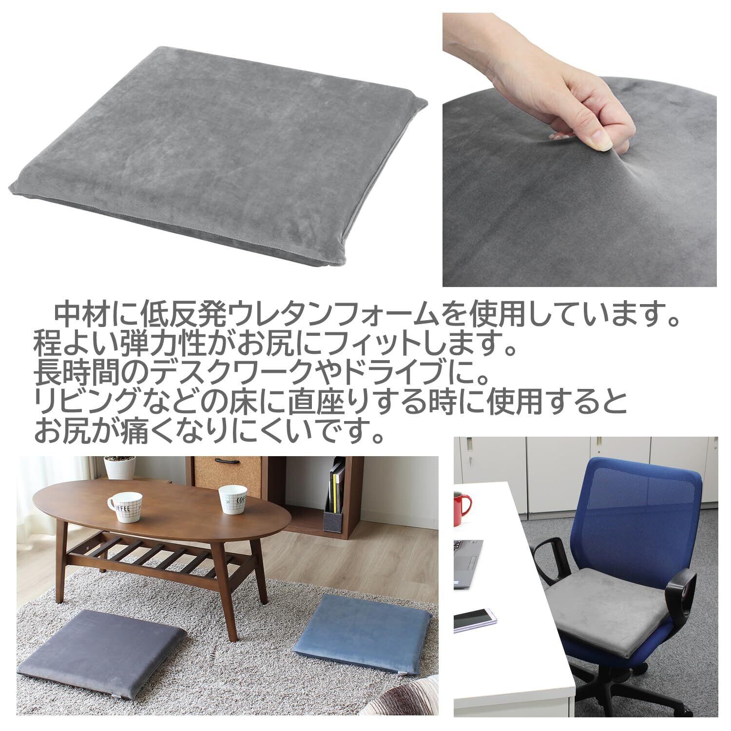 長時間のデスクワークやドライブに。リビングなどの床に直座りする時に使用するとお尻が痛くなりにくいです。