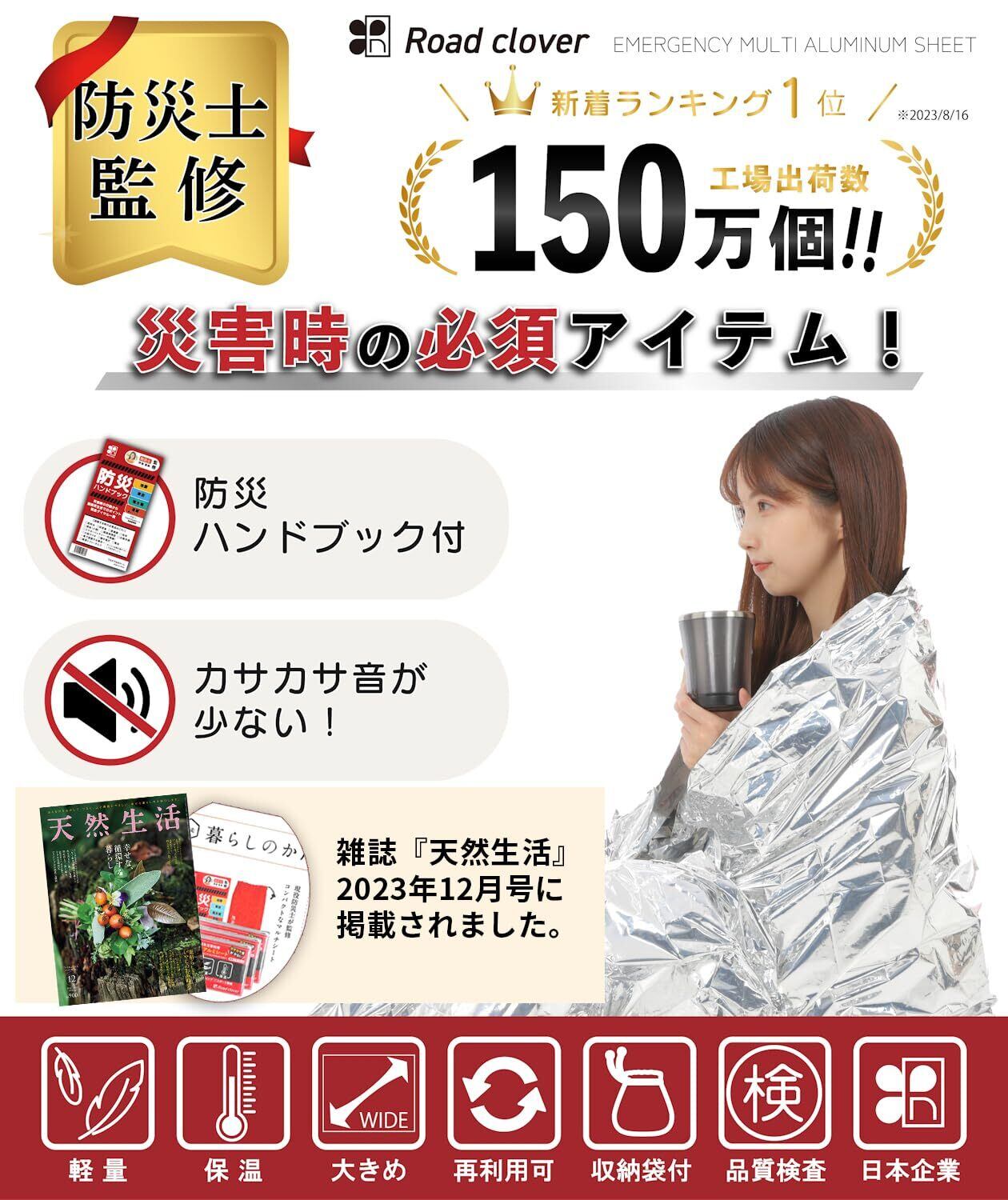 このマルチアルミシート(サバイバルシート)は、現役防災士の監修により開発されました。防災ハンドブックが付属しており、災害対策から被災後の生活支援に至るまで、防災グッズとしても広範な知識が提供されています。また、専用の収納袋が付属し、さらにパッケージにメモ領域が設けられているなど、防災士による経験豊かな智恵が活かされています。