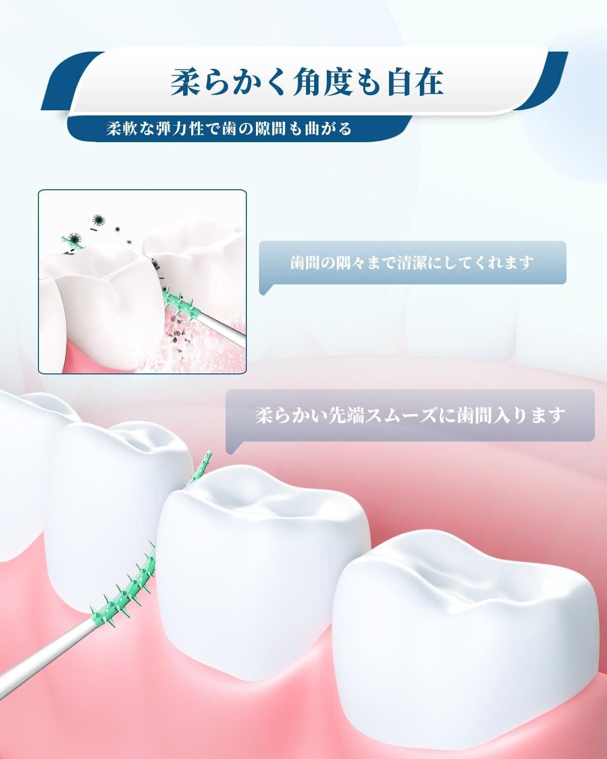 柔軟弾力性、使いやすい:柔らかい先端スムーズに歯間入ります、角度も自在、良く曲がり奥歯間まで届き磨きやすい。歯間ブラシ 歯の根元のカスが取れます、歯の隙間の部分が綺麗になります。