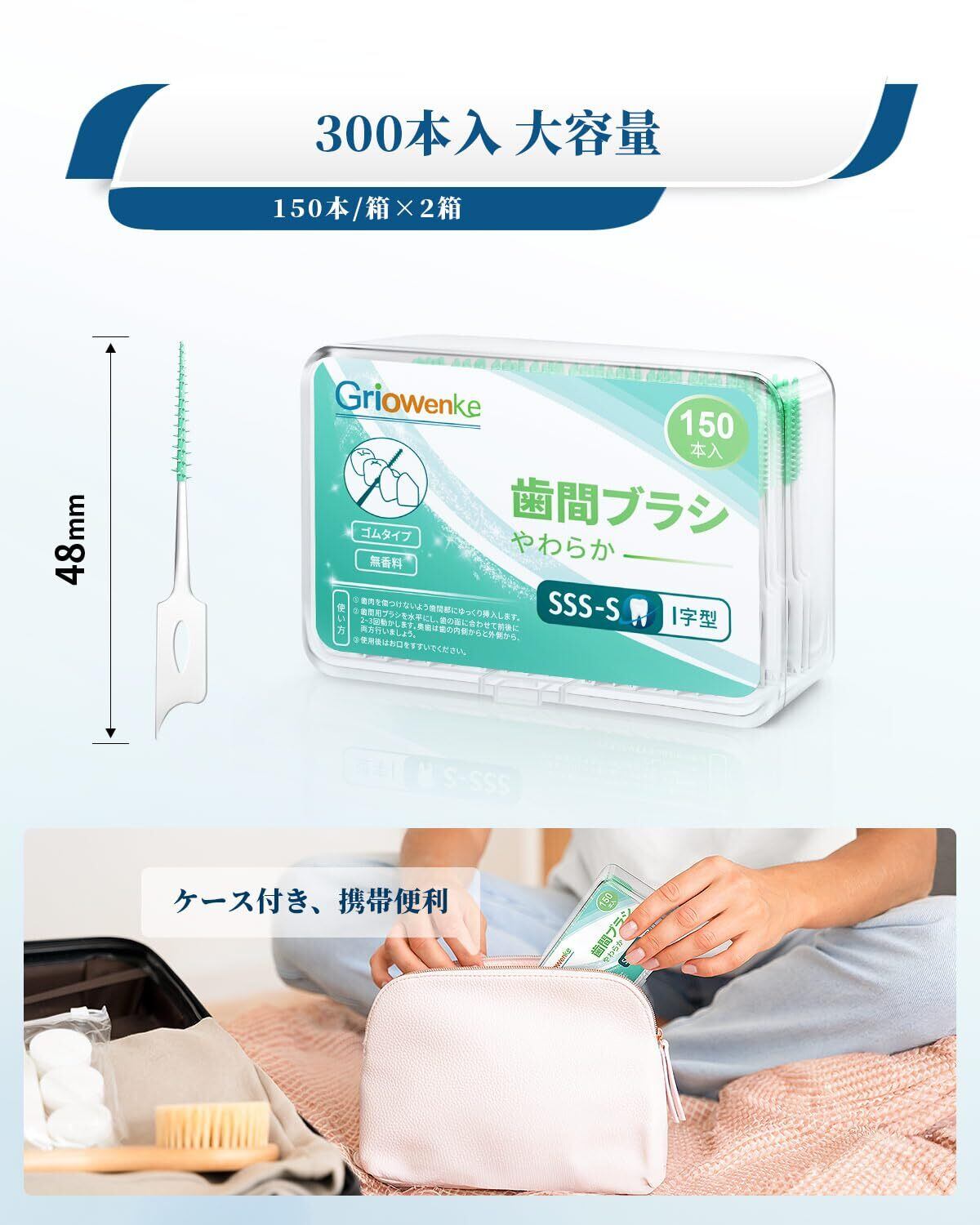 300本入 歯間ブラシ 大容量:150本/箱x2箱。サイズ仕様:SSS-S I字型。やわらか しかんぶらし 極細 ブラシ 歯間、歯ブラシ(歯かんブラシ)では掃除できない部分を掃除するのに役立ちます。