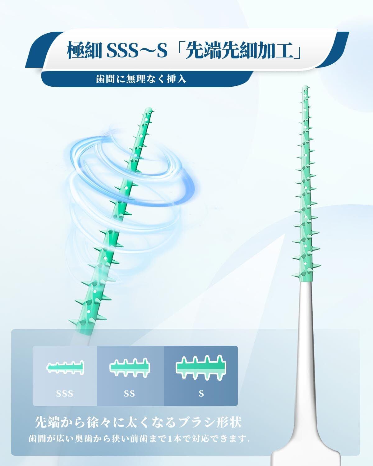 SSS-S 歯間ブラシ、入りやすい:細いしかん歯ブラシならSSS~Sサイズ 先端先細設計、狭い歯間にもきちんと入。細い先端SSSから太い根元Sまであるので、隙間によって使い分けができます、歯間が広い奥歯から狭い前歯まで1本で対応できます、歯の間に詰まったものもよく取れます。