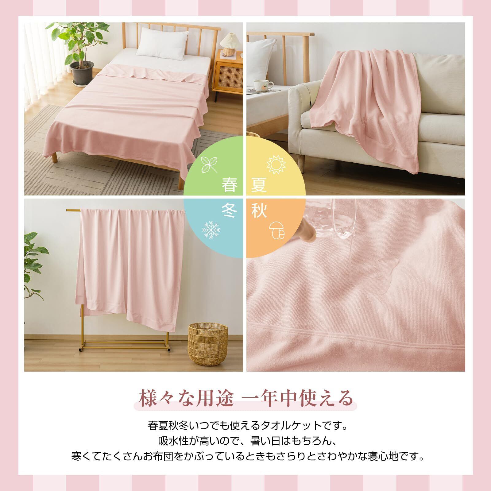 【様々な用途】汗ばむ季節は吸水性があるのでサラッと快適で、肌寒い季節は毛布の代わりに布団のインナーとしても使えます。また、ホームだけでなく、温泉・旅行・お花見などいろいろなシーンで大活躍します。
