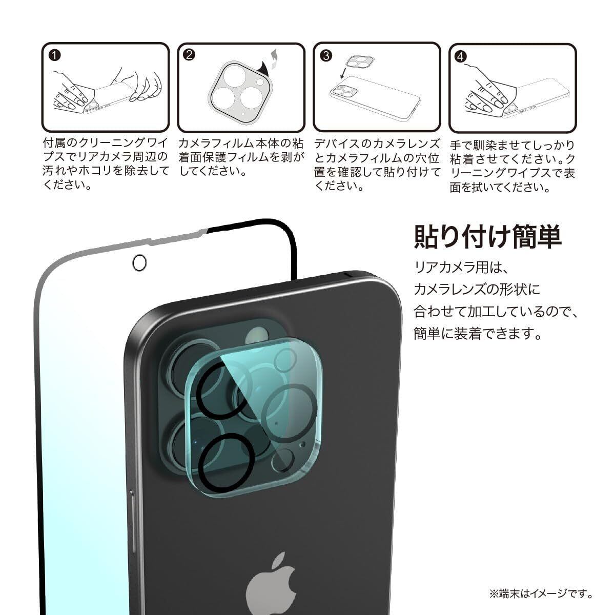 リアカメラ用は、カメラレンズの形状に合わせて加工しているので、簡単に装着できます。
