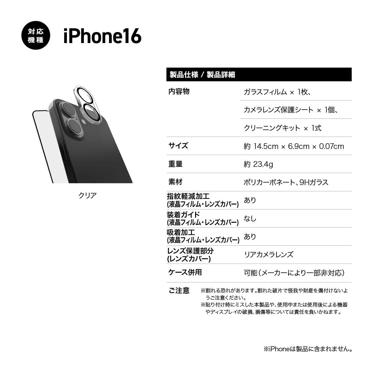 【製品仕様】… ◆ 対応機種 : iPhone16 ( アイフォン16 ) ◆ 内容物 : ガラスフィルム × 1枚、カメラレンズ保護シート × 1個、クリーニングキット × 1式 ◆ サイズ : 約 14.5cm × 6.9cm × 0.07cm ◆ 重量 : 約 23.4g ◆ 素材 : ポリカーボネート、9Hガラス