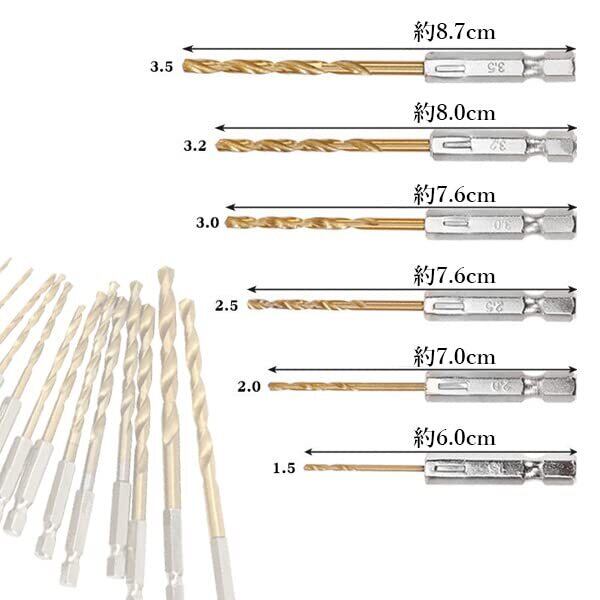 ・チタンコーティング仕上げのドリルビット13本セットです。 ・業務用としてだけではなく、DIYなど日曜大工時にもおすすめです。 ・電動ドリルやインパクトドライバーなどに装着して使用できます。 ・鉄やプラスチック、木材など幅広い場面で使用できます。 ・サイズ:1.5mm 2mm 2.5mm 3mm 3.2mm 3.5mm 4mm 4.5mm 4.8mm 5mm 5.5mm 6mm 6.5mm 計13本 【商品仕様】 表面処理 チタンコーティング