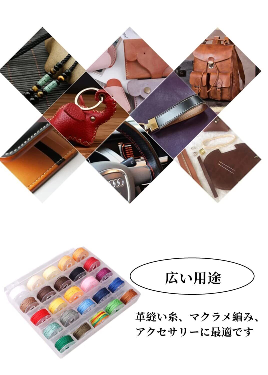 【幅広い用途】革縫い糸、マクラメ編み、アクセサリーに最適です。DIYや手芸にピッタリ!ハンドメイド・ハンドクラフトの財布やキーケース、カードホルダー、名刺入れや鞄などの小物作りなどにお使い頂けます。