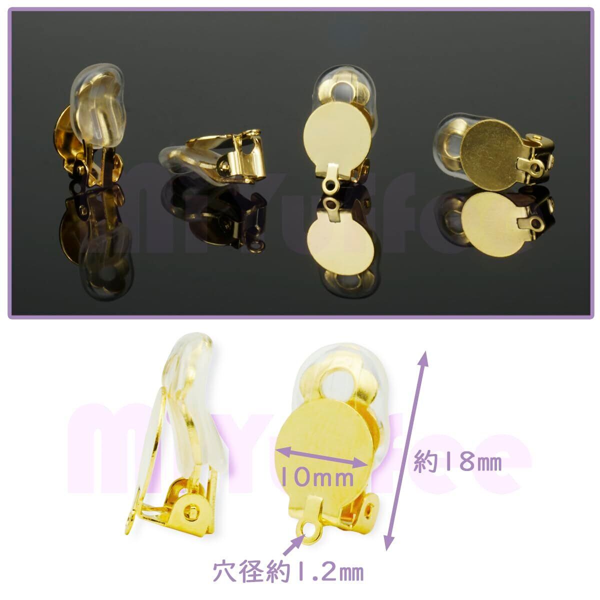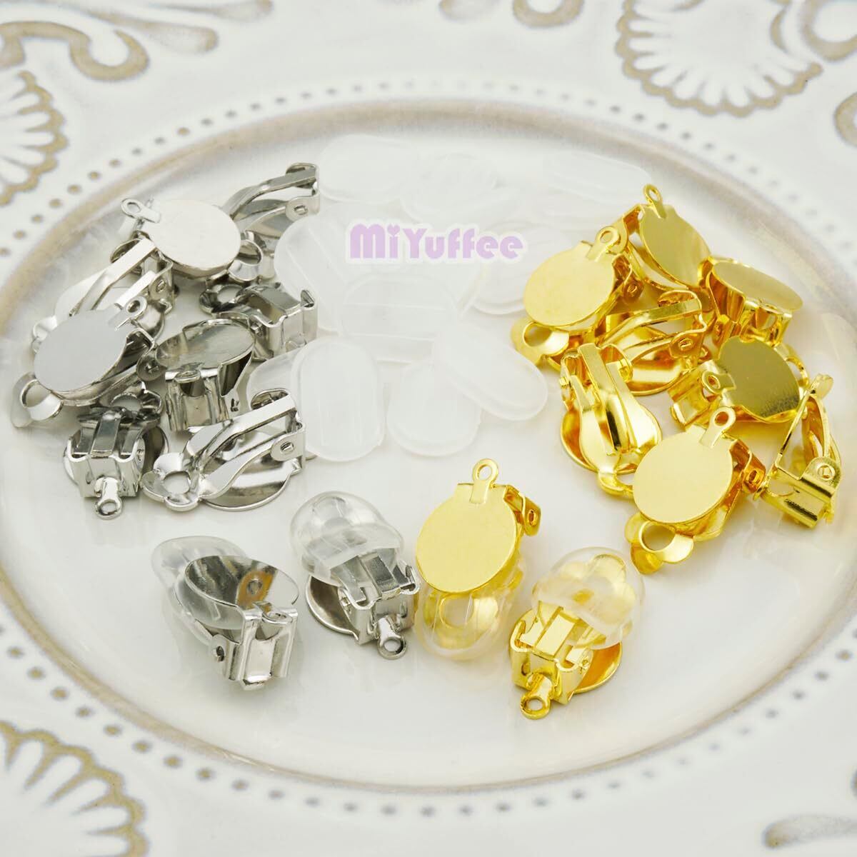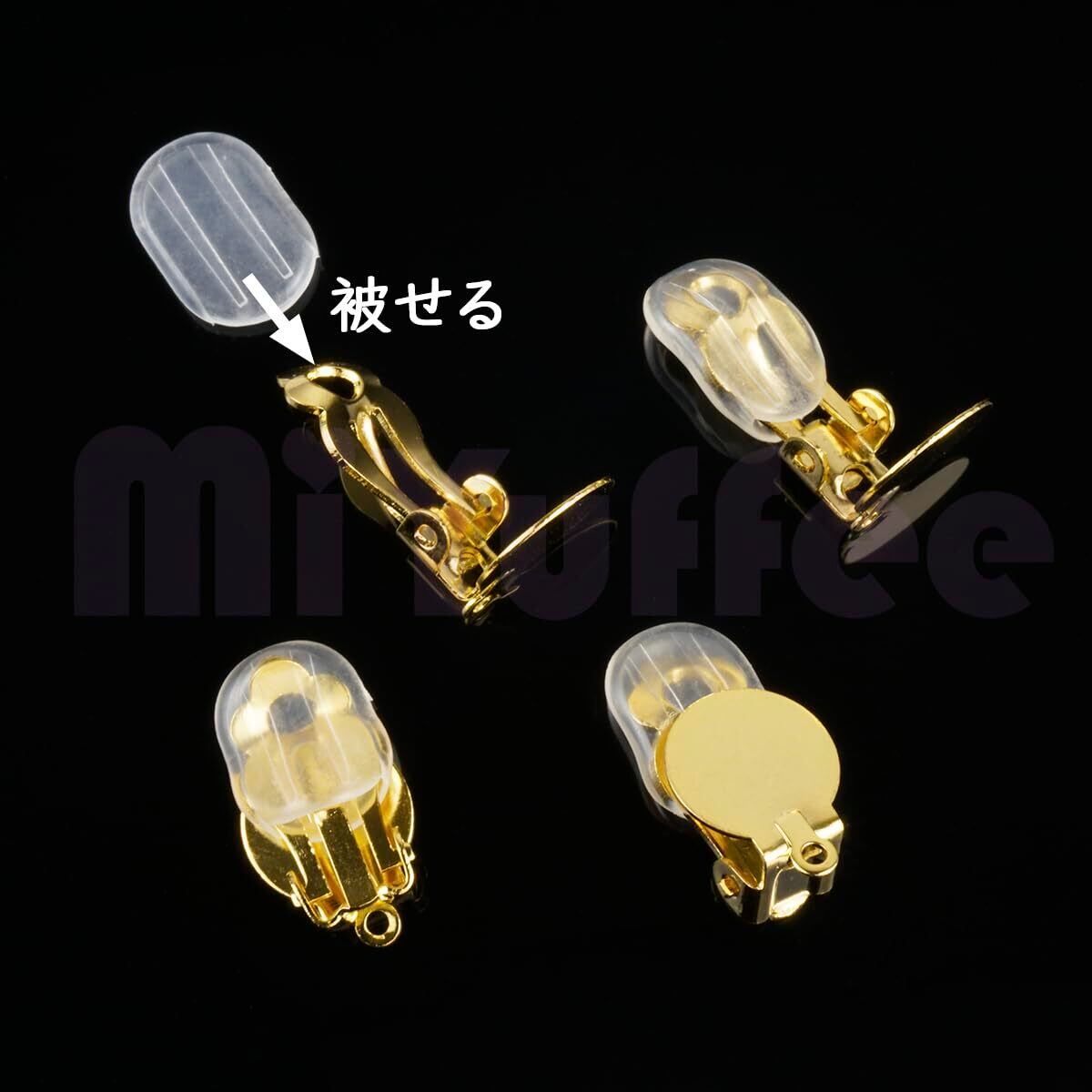 10mm丸皿とカン付きのクリップ式イヤリングパーツとシリコンカバーのセットです。耳たぶに挟むように使うタイプのイヤリングを作成するためのハンドメイド用金具です。
