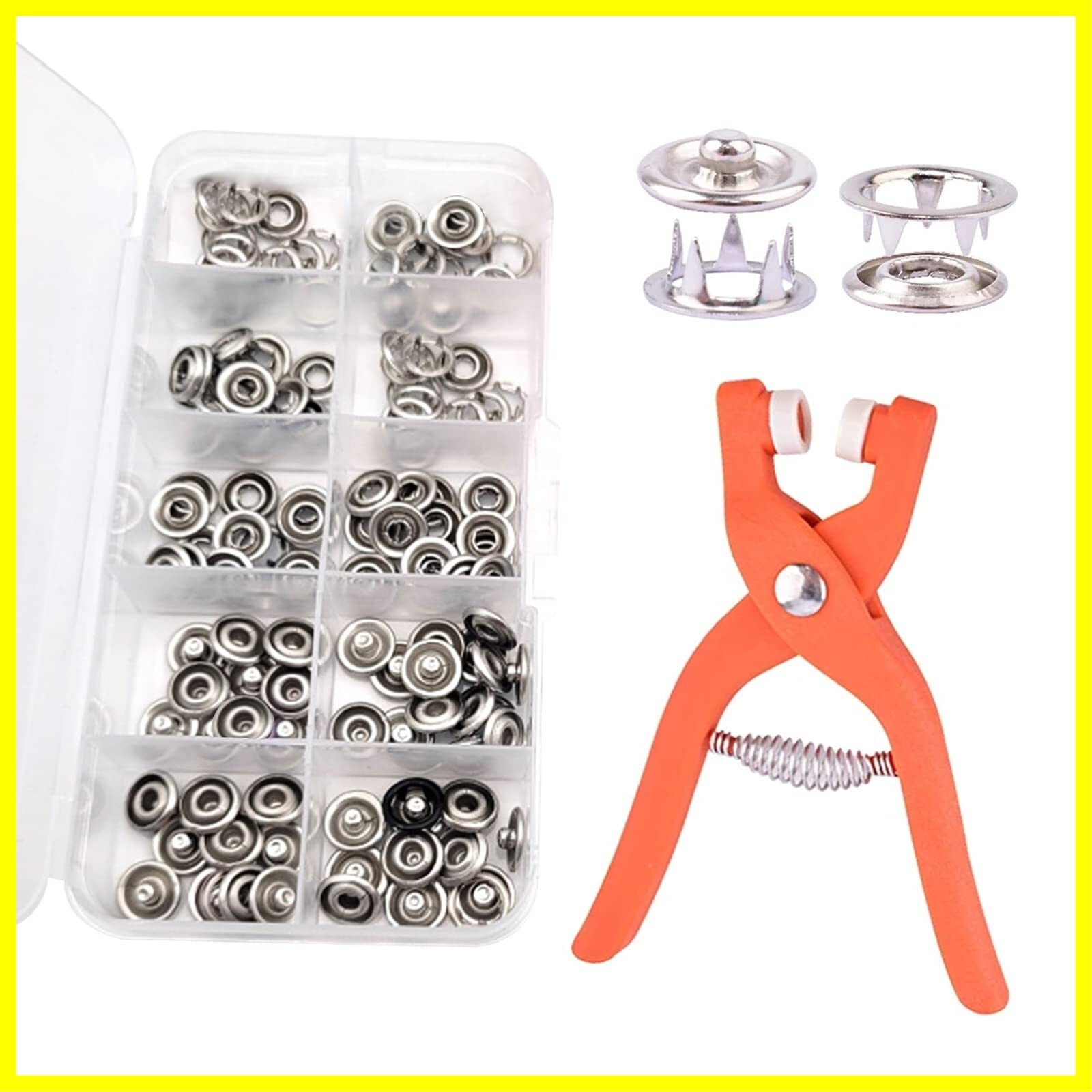 【セット内容】100個(25セット)のメタルスナップボタンファスナー、とクラフト用クランプツールセット。収納ポーチ付き。 【丈夫な素材】スナップボタンは高品質の金属製で、明るく丈夫で耐久性があります。 【使いやすい】押したらオッケー!糸も針も使わずに付けられる。取り付けプロセスが完了したことを示すスナップ ファスナーのポップ音が聞こえます。 【初心者】女性、または初心者の仕立て屋に適しています。初心者でもすぐ使いこなせます。また、仕切り付きのケースがあるので、超便利です。 【幅広い用途】ジャンプスーツ、おむつ、ベビー服、シャツ、スカート、ジーンズ、バッグ、ベルト、財布、靴、DIY クラフト用です。