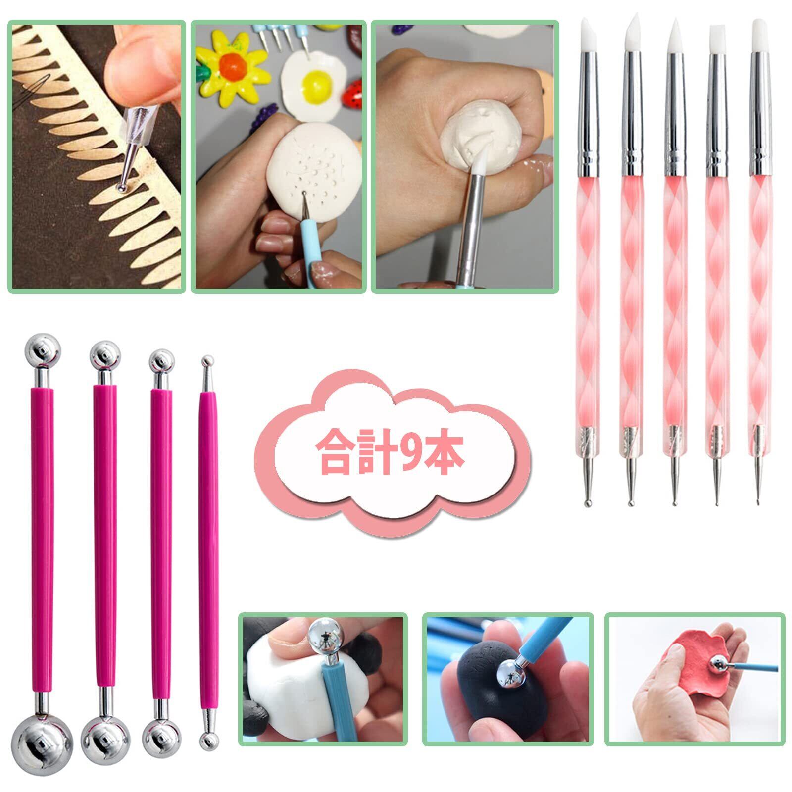 DanYun 9本セット 18タイプ 陶芸 粘土 道具 細工棒 クレイ ツール 丸 ヘラ シリコン筆 シリコン筆 粘土彫刻ツール ネイルアート 粘土細工 お手入れ用 クロス ピンク