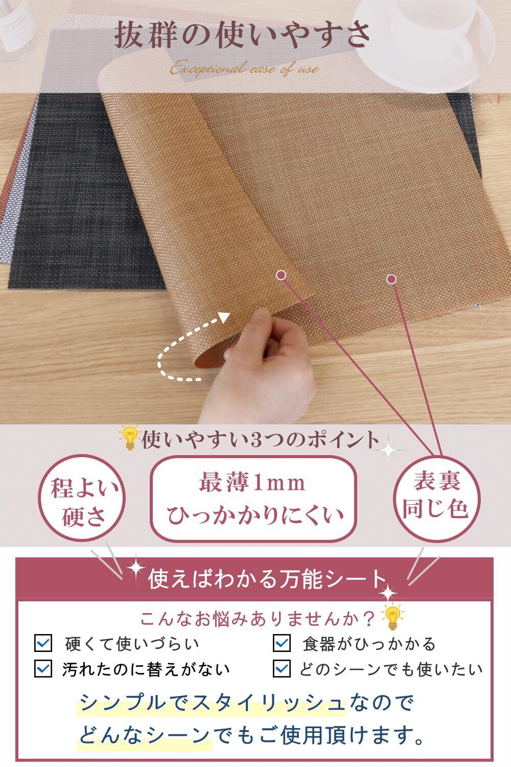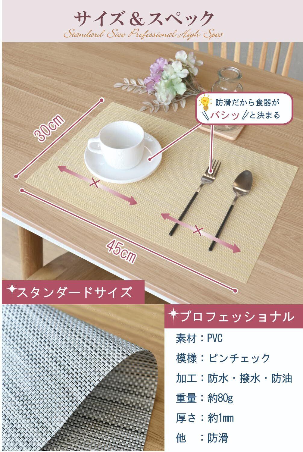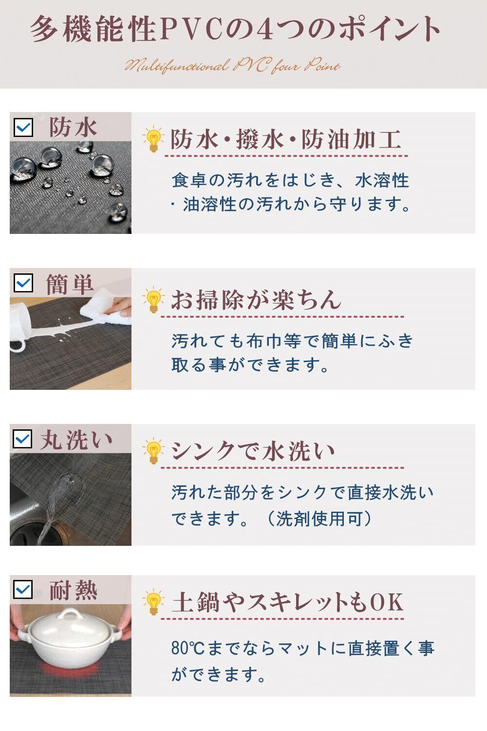 機能性とデザイン性を兼ね備えた、PVCランチョンマット。 どんなテイストにも馴染みやすい豊富なバリエーションは、毎日のテーブルをドレスアップしてくれるアイテムです。 しっかりした素材感と、テーブルに馴染みながら映えるカラー。 汚れに強い撥水素材は、さっと水で流すだけの簡単お手入れでOK。 パーティーや来客など特別な日はもちろん、お食事からティータイムまで、普段使いにも最適です。 くるくると丸めると収納も簡単