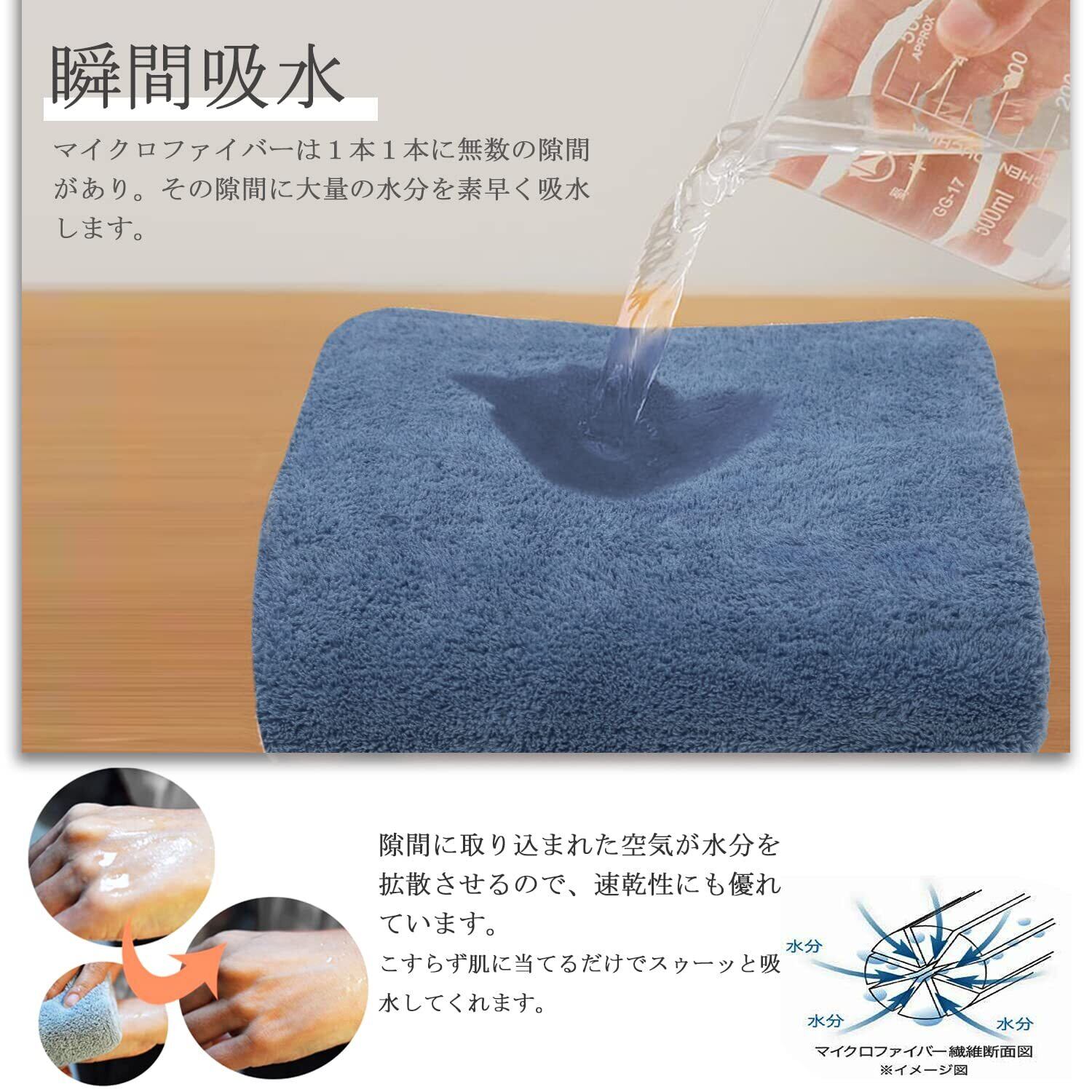 【抜群の吸水力】髪の毛の100分の1以下という極細の繊維でできたバスタオルです。吸水量は綿タオルの約3倍以上です。髪や肌をゴシゴシする必要はなく、サッと水を吸着してくれます。