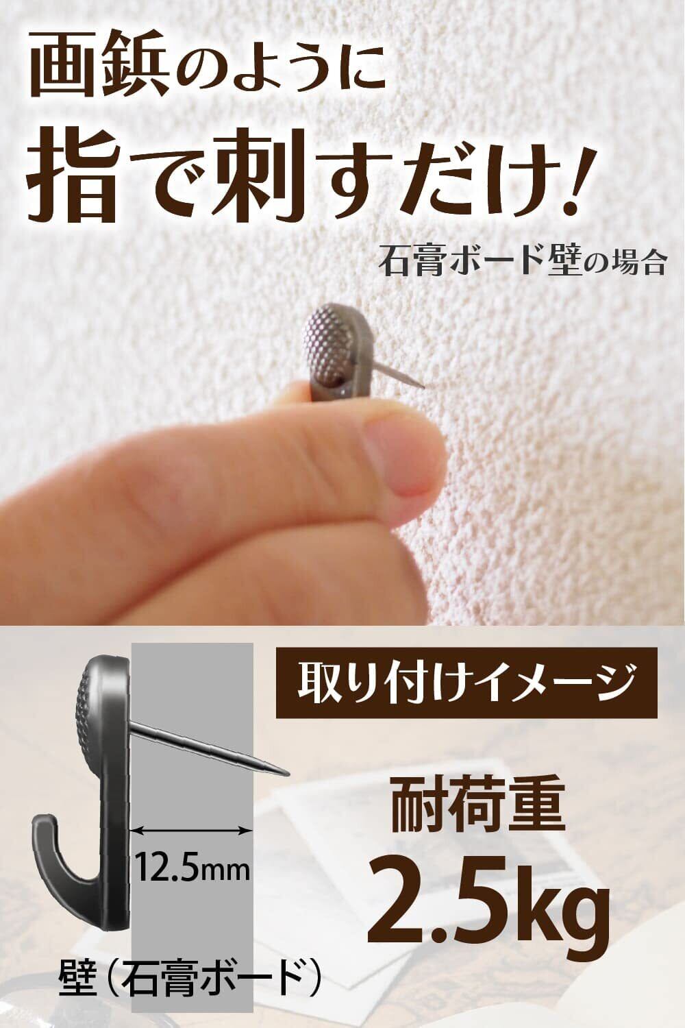【取り付け方法】 石膏ボード壁なら指で押すだけでOK。斜めに刺さる設計により、しっかりと固定されます。針の長さ15mmで、壁にしっかりと固定できるため安心です。工具不要で簡単に取り付けられ、取り外しも容易。石膏ボード用ピンフック、石膏 壁 ピン、押しピン フックとして機能的な設計です。