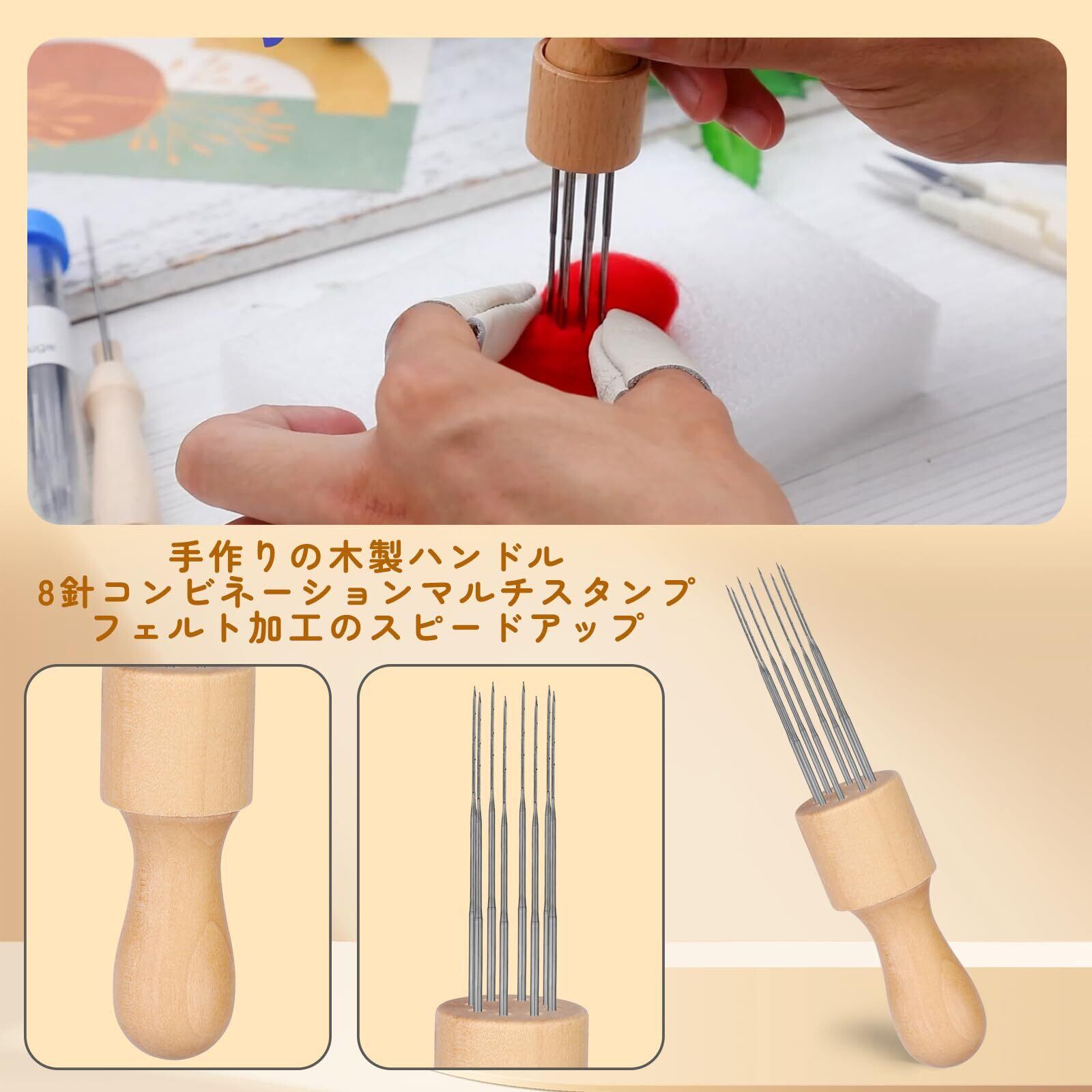 ニードルフェルト針 8本: 複数のニードルを一度に使用できるタイプの場合、一度にたくさん刺すことができるので、単純に作業スピードが上がります。特に広い面積をフェルト化したい場合、1本のニードルだけで作業するのとは完成までにかかる時間は全く異なります。木製なので持ちやすくて手に優しい。