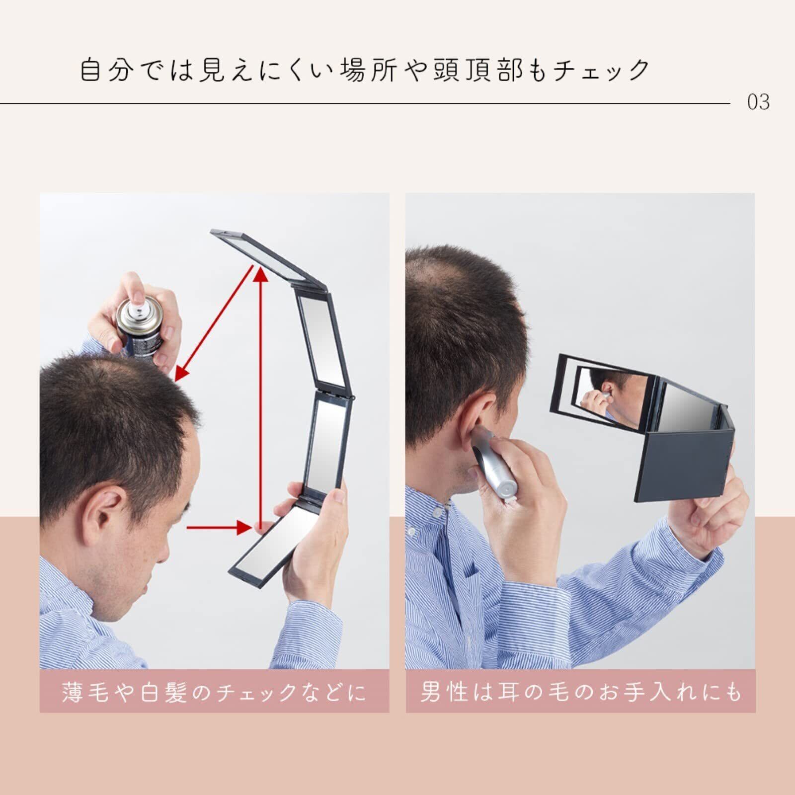 見えにくいところを簡単チェック!目頭から目尻までメイクバランスをしっかりチェック!頭頂部も簡単に見れて白髪チェック、毛染めやウィッグの確認に最適!