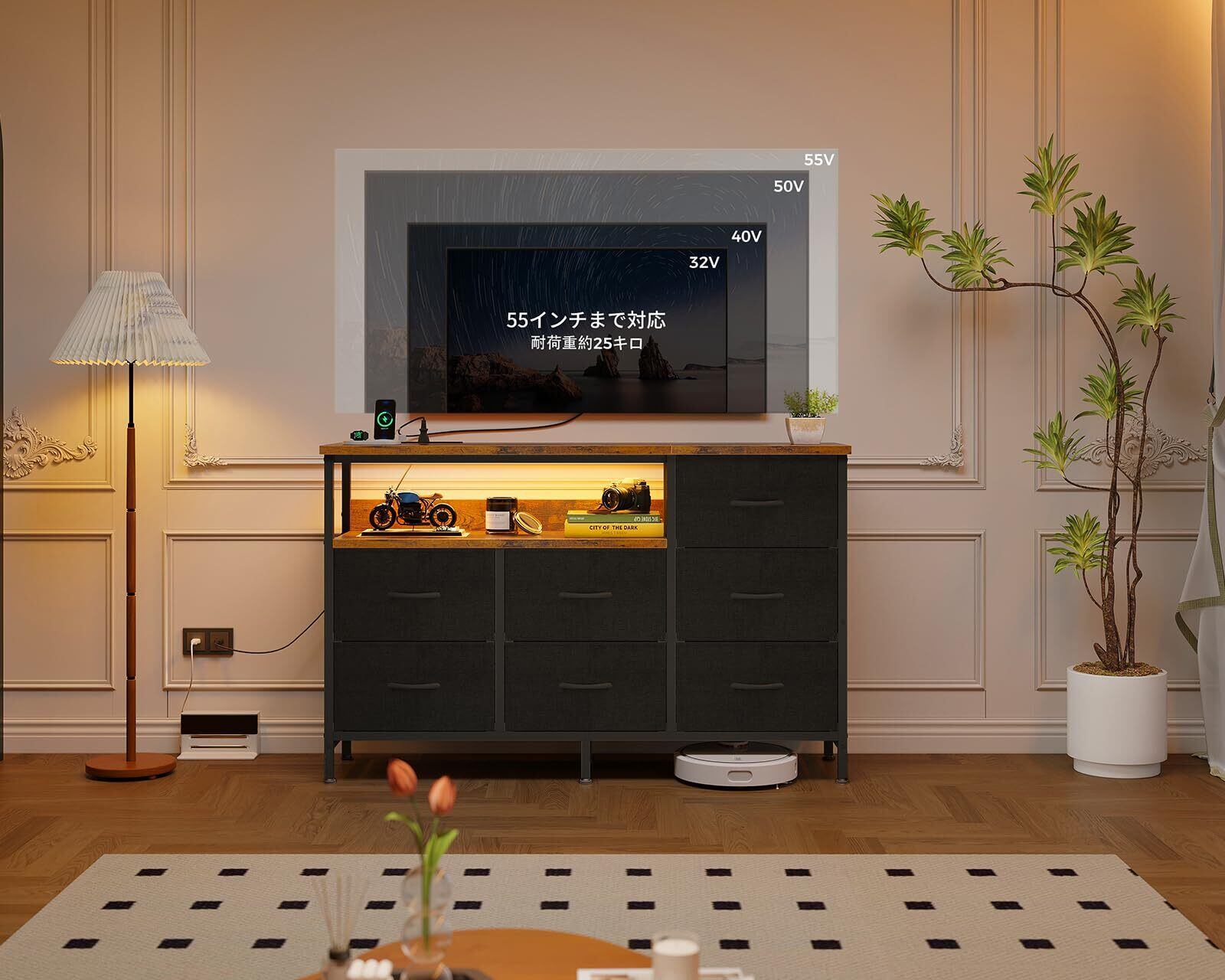 AODK タンス チェスト コンセント&LEDライト付き 幅132×奥行30×高さ90cm テレビ台 リビング 収納 大容量 洋服タンス 収納ケース 衣装ケース 布製引き出し 箪笥 おしゃれ 転倒防止 安定感 3段7杯 ブラック&ビンテージ