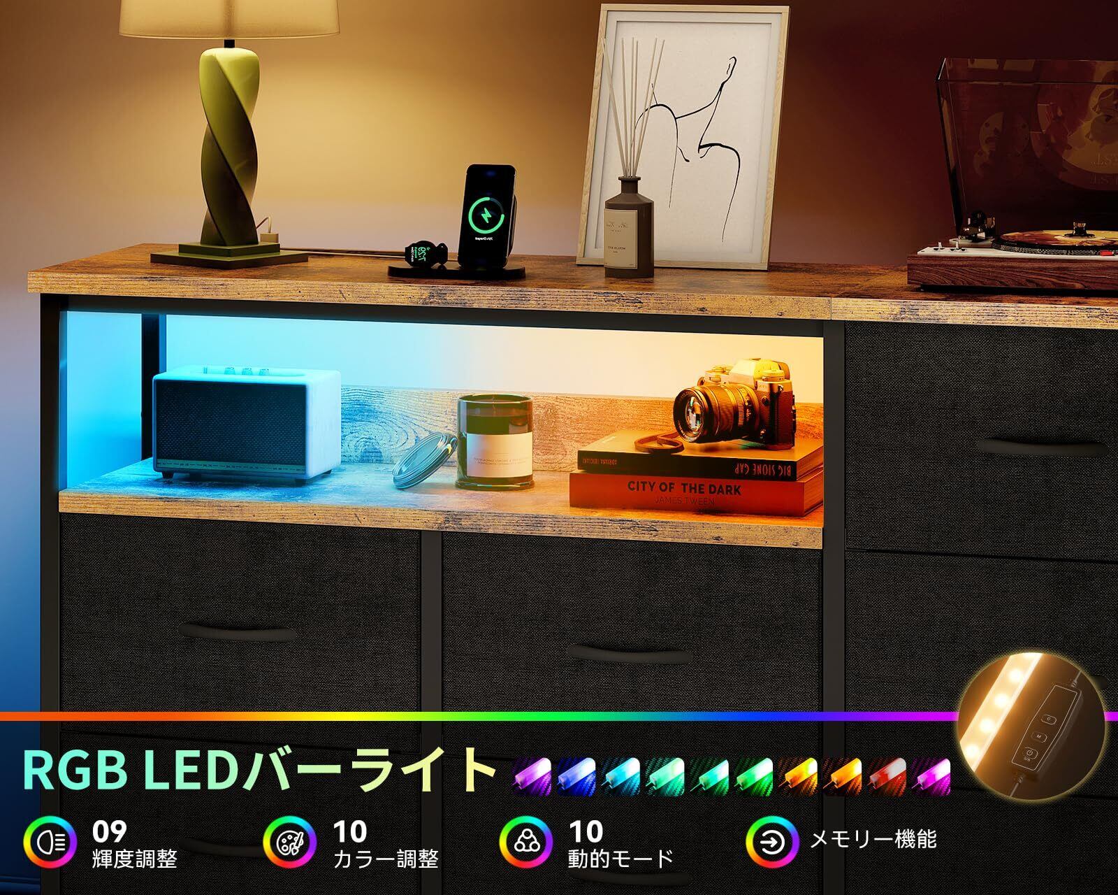 【空間の印象を光で変える】タンスには10段階調色・9段階調光のLED RGBバーライトを搭載しており、気分やシーンに合わせて光をデザイン。虹色モードもサポートし、お部屋の一角をあなたの理想の空間に変える。