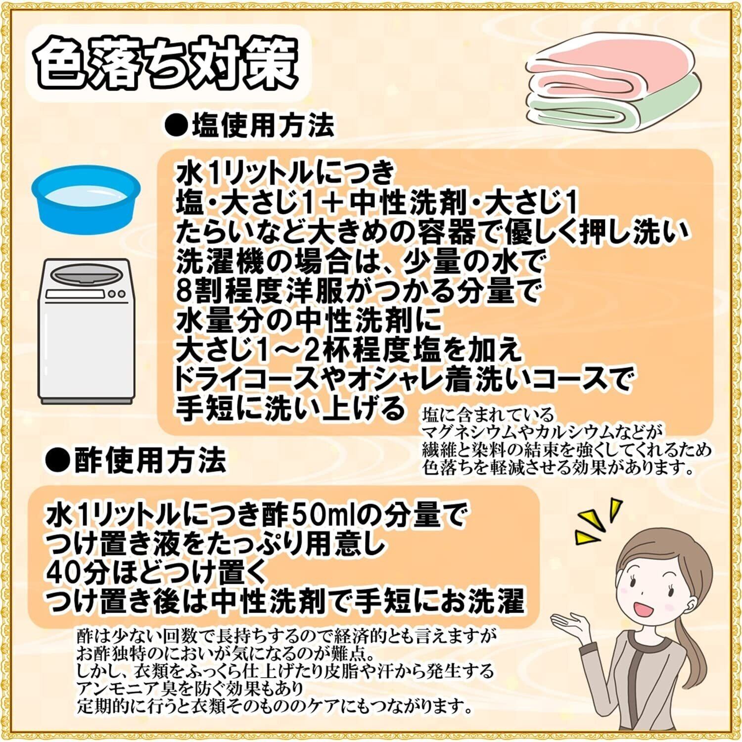 【お手入れ方法】中性洗剤で、出来るだけ単品洗いしてください。【色落ち対策】●水1リットルにつき、塩・大さじ1+中性洗剤・大さじ1、たらいなど大きめの容器で優しく押し洗い。洗濯機の場合は、少量の水で8割程度洋服がつかる分量で水量分の中性洗剤に大さじ1~2杯程度塩を加え、ドライコースやオシャレ着洗いコースで手短に洗い上げる。●水1リットルにつき酢・50mlのつけ置き液を用意し、40分ほどつけ置き、その後は中性洗剤で手短に洗濯。【お手入れ方法】中性洗剤で、出来るだけ単品洗いしてください。【色落ち対策】●水1リットルにつき、塩・大さじ1+中性洗剤・大さじ1、たらいなど大きめの容器で優しく押し洗い。洗濯機の場合は、少量の水で8割程度洋服がつかる分量で水量分の中性洗剤に大さじ1~2杯程度塩を加え、ドライコースやオシャレ着洗いコースで手短に洗い上げる。●水1リットルにつき酢・50mlのつけ置き液を用意し、40分ほどつけ置き、その後は中性洗剤で手短に洗濯。