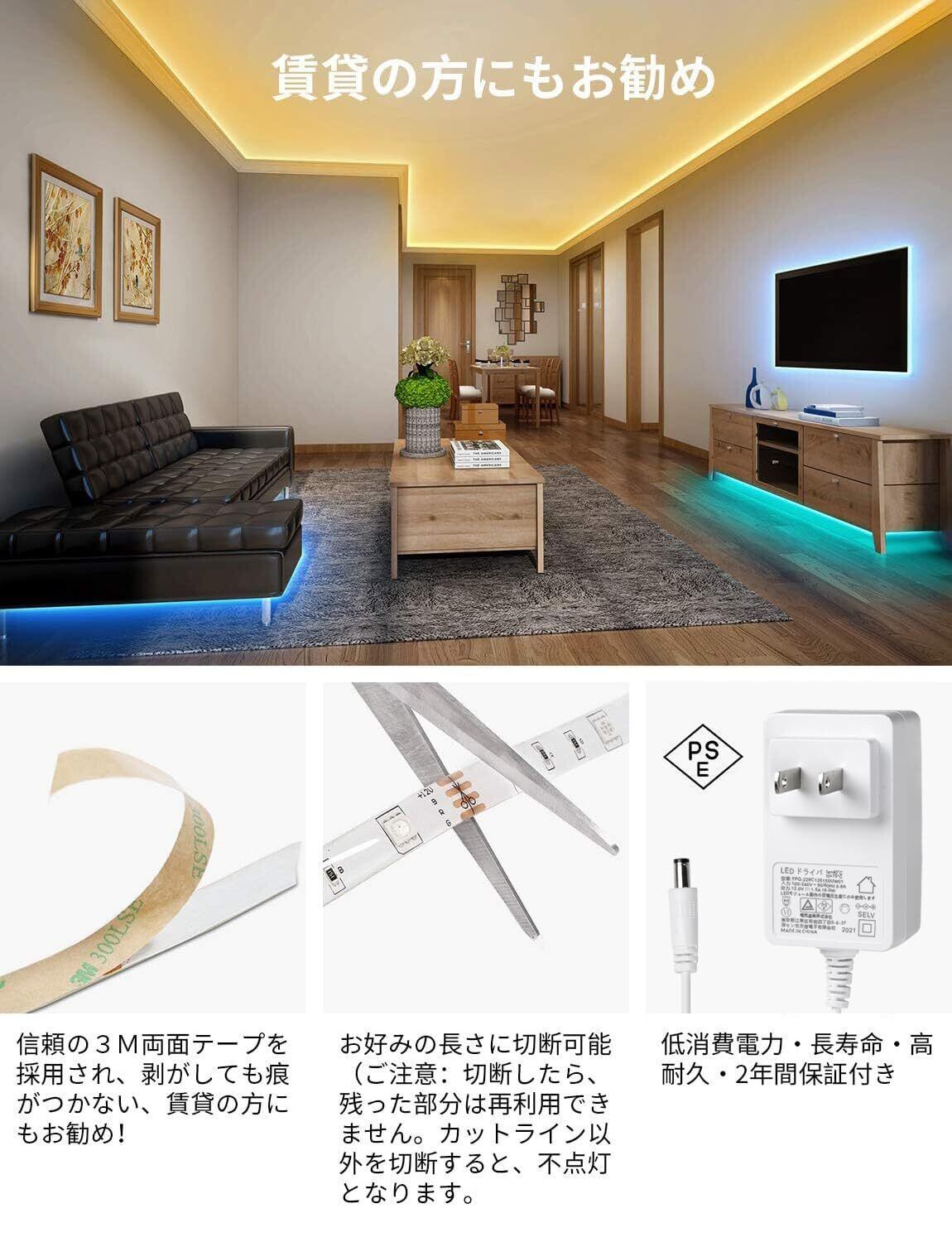 【簡単設置&DIY・切断可能】裏面には強力な3M両面テープが付いているため、取り付けが簡単です。柔軟性があるため自由に曲げることができ 、直線はもちろん、曲線のコーブ照明やコーニス照明にも適応します。食器棚、テレビ、パソコン、バーカウンターなどの装飾や、クリスマスの飾りとしても活躍します。LEDテープを剥がしても痕がつかない、賃貸の方にもお勧め!お好みの長さに切断でき、自由自在にDIY可能!『ご注意:切断すると残った部分はコネクター(別売り)がないと再利用できないことを予めご了承下さい』
