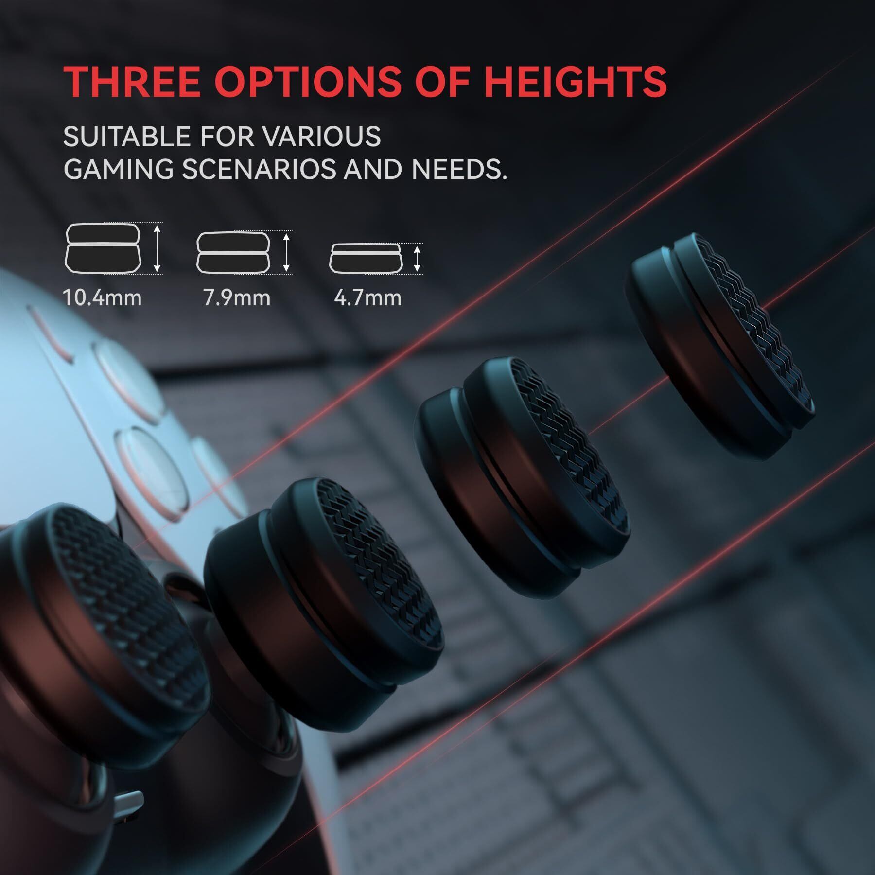 様々なゲームジャンルに対応するコンボの高さ。トールキャップは手の大きなプレーヤーのために感度を高め、ミディアムキャップは精度を高め、ショートキャップは操作時の快適さを優先しています。