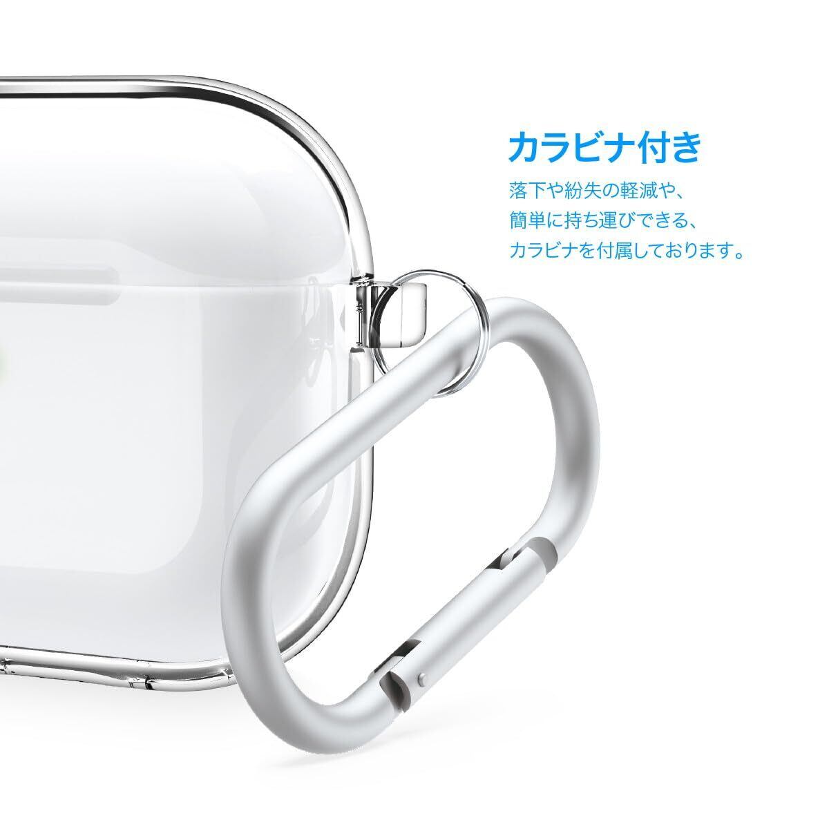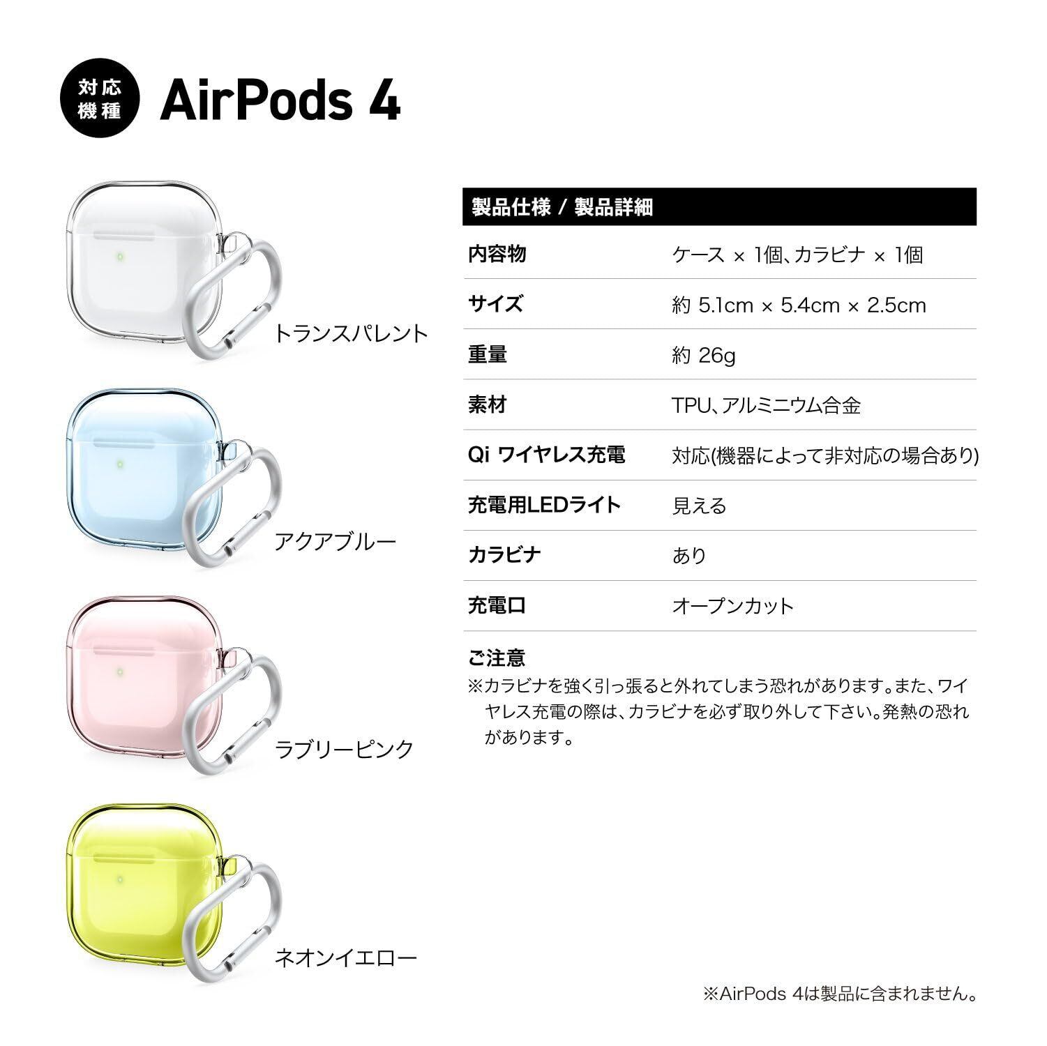 【製品仕様】… ◆ 対応機種 : Air Pods 4 ( エアポッツ4 ) ◆ 内容物 : ケース × 1個、カラビナ × 1個 ◆ サイズ : 約 5.1cm × 5.4cm × 2.5cm ◆ 重量 : 約 26g ◆ 素材 : TPU、アルミニウム合金