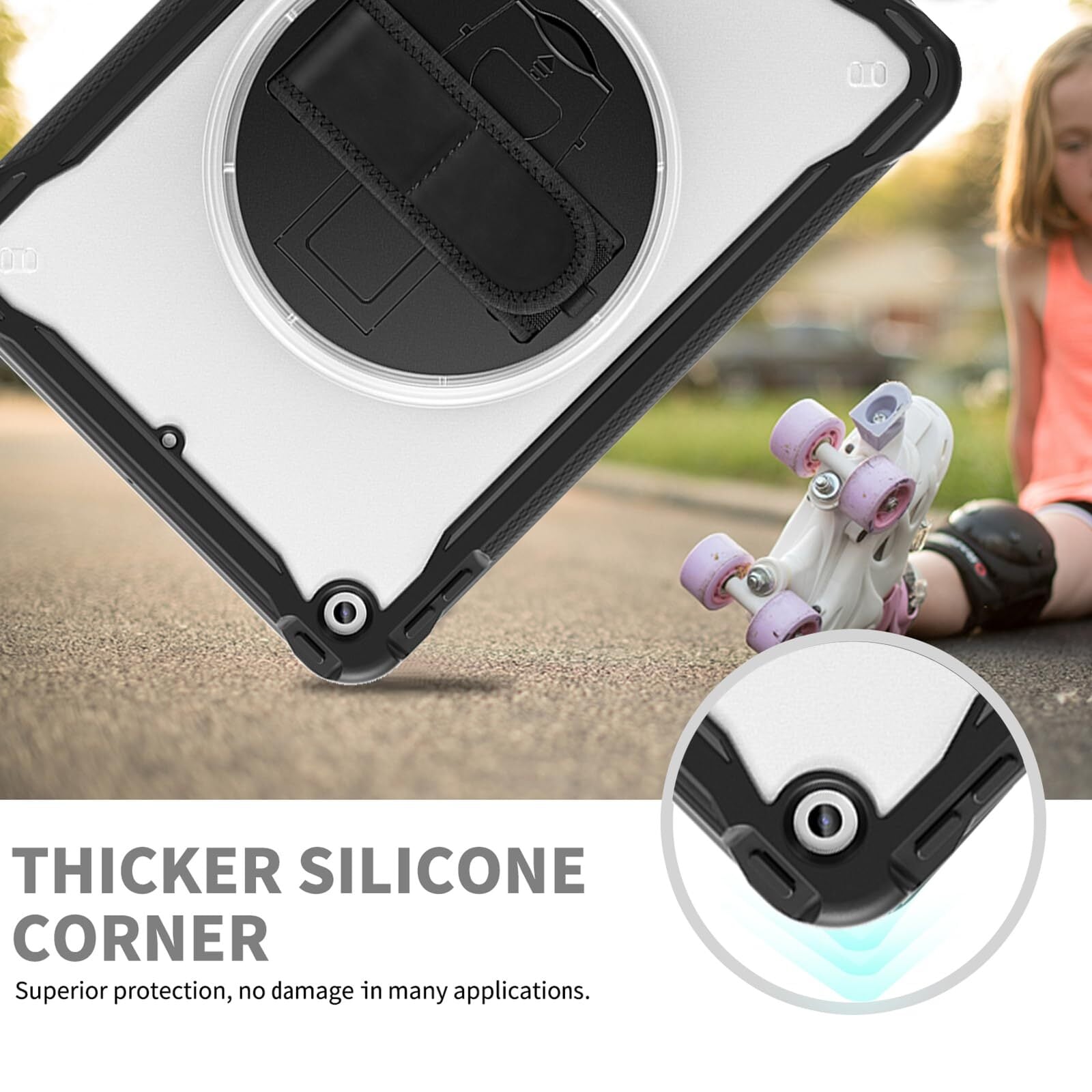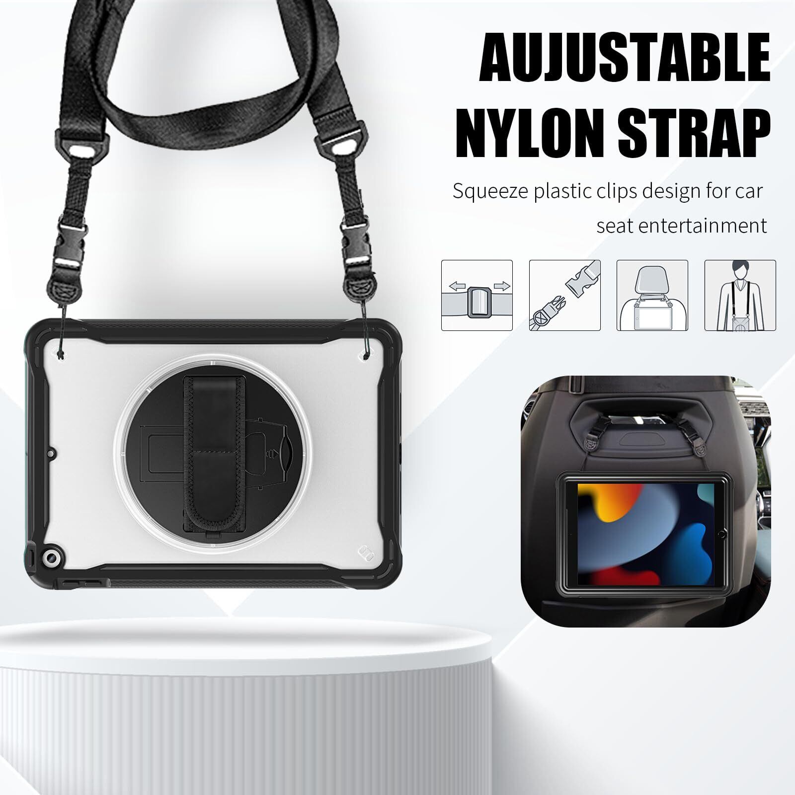【iPad 7世代 ケース 幅広いニーズに対応】:ビジネス、アウトドア、学校、家事など様々なシーンで大活躍。子供、キッズがいる家庭にもおすすめ。首に掛けて写真を撮ったりしたり、ストラップを車のヘッドレストに取り付けて後部座席のエンターテイメント用としても使用する事も可能です。