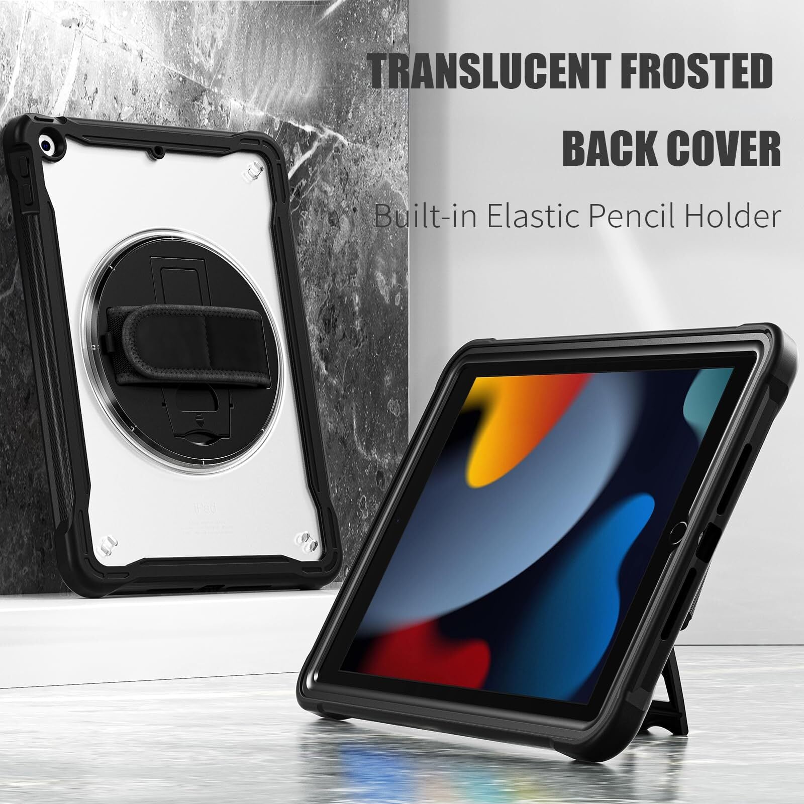 【iPad 9世代 ケース スタンドとハンドホルダー】:360度回転&段階調節可能スタンドによって、動画視聴やゲーム、仕事などの作業が楽に行えるようになりました。ハンドホルダーを使用しながら操作する事により、落下の危険を軽減する事が出来ます。