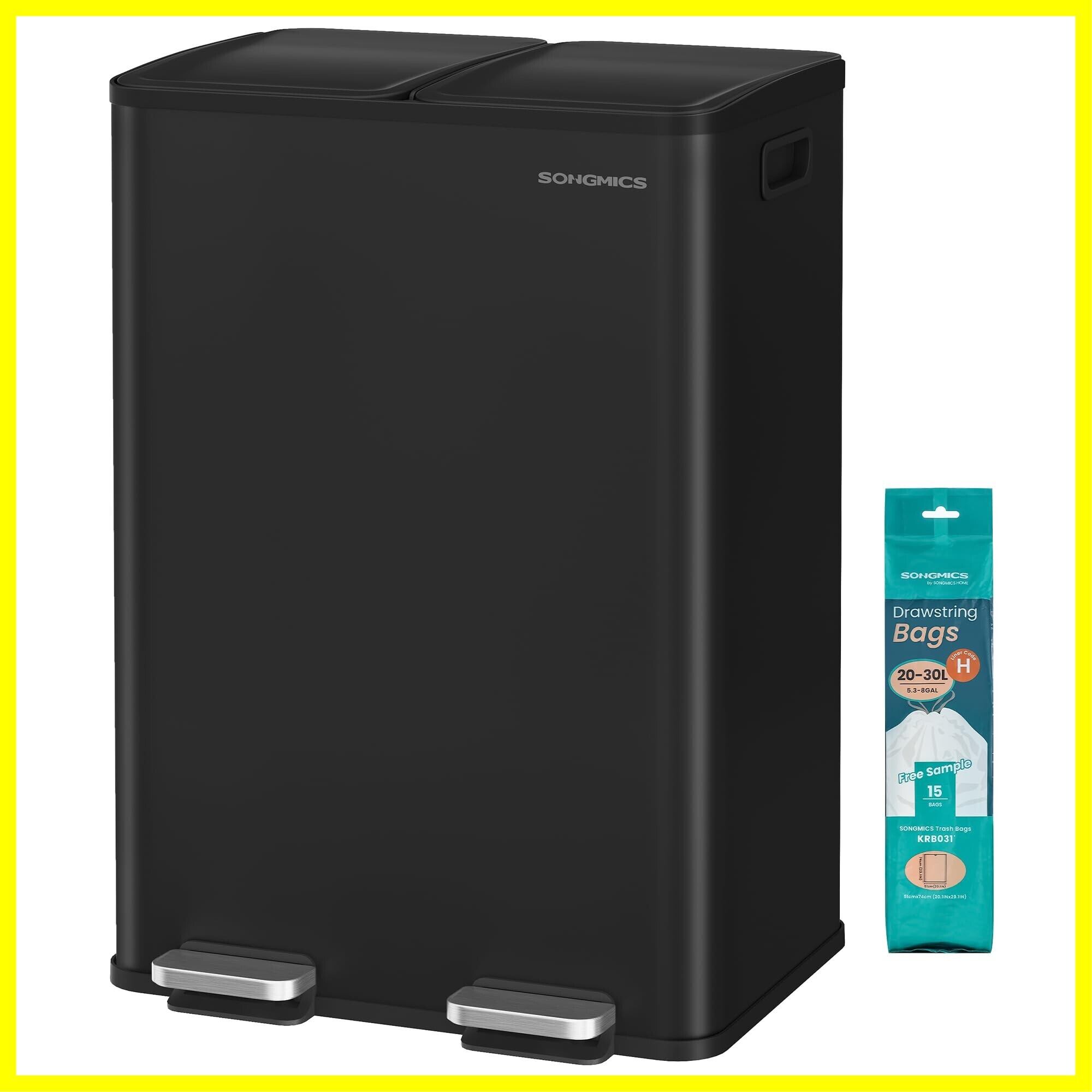 SONGMICS ゴミ箱 分別 2x30L ふた付きダストボックス キッチン用 ペダル式 大容量 幅47.6cm ゴミ袋付き インナーバケット二つ ステンレス製 目隠し 音無し おしゃれ ブラック LTB741B02