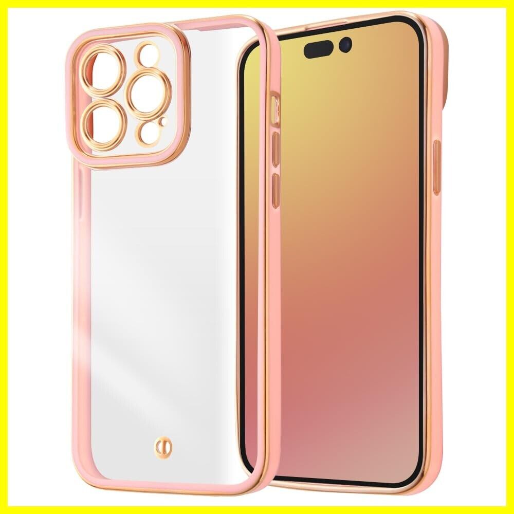 iPhone15 ProMax ケース クリア メタル フレーム カメラ保護 耐衝撃 メッキ加工 ストラップホール 付き アイフォン 15 プロマックス カバー/ピンク/ゴールド