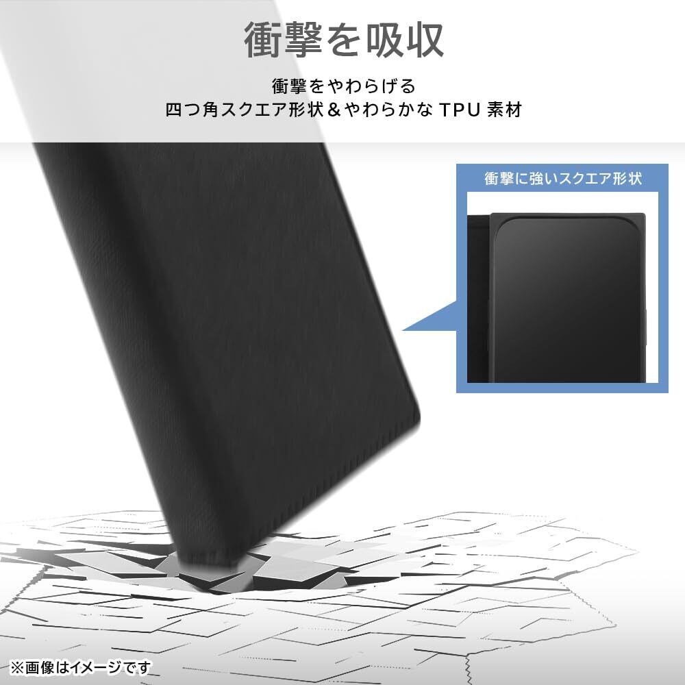 スタイリッシュなフォルムの手帳型ケース / 内側は耐衝撃性の高いスクエアのTPUケースを採用 / マグネット不使用で安心 / 傷に強く、撥水性のあるレザーを使用