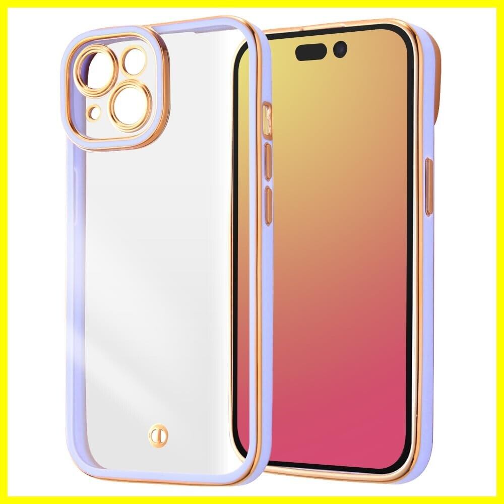 iPhone15 ケース クリア メタル フレーム カメラ保護 耐衝撃 メッキ加工 ストラップホール 付き アイフォン 15 カバー/ラベンダー/ゴールド