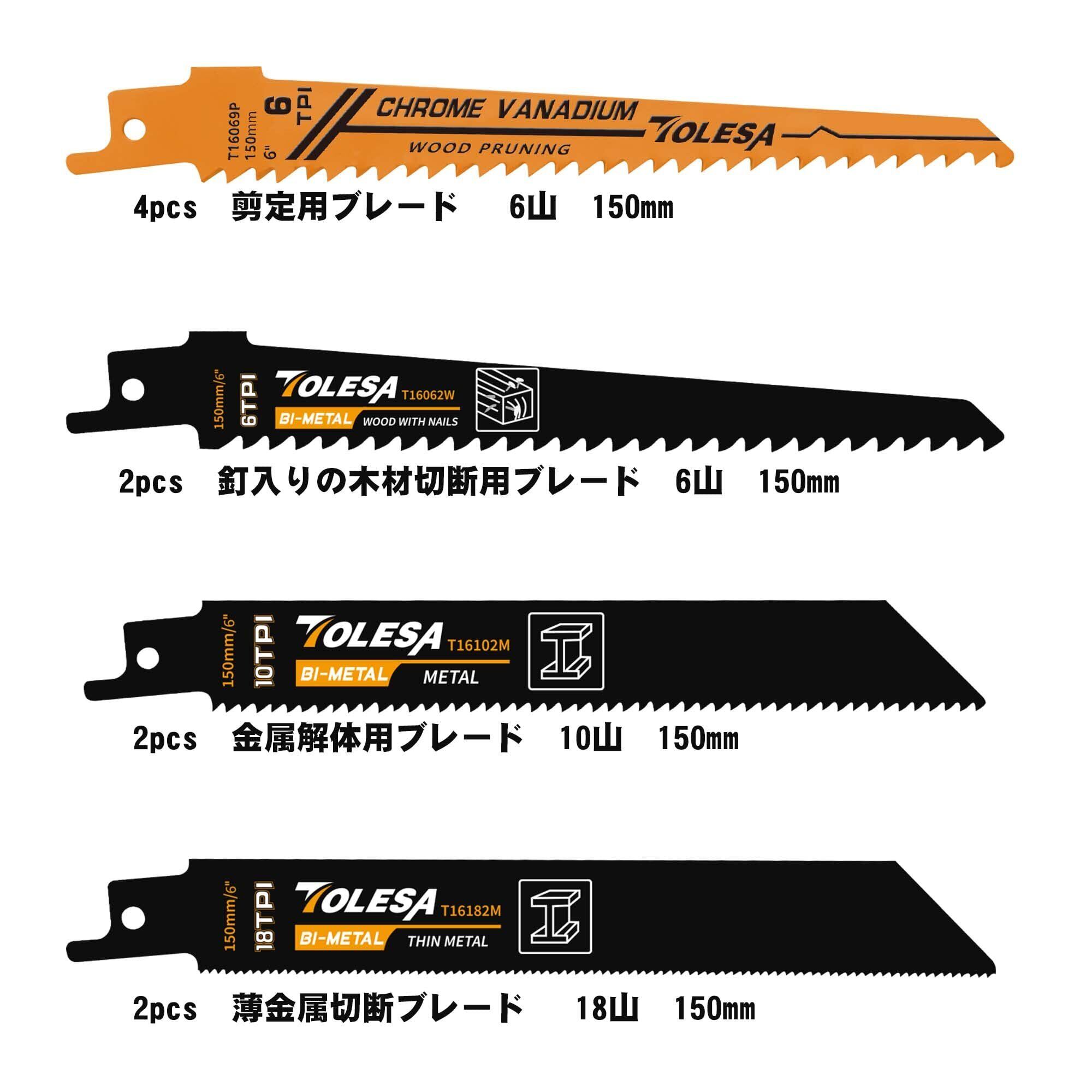 【豊富種類セット】2本*6山 バイメタル釘入りの木材切断ブレード、2本*10山 バイメタル金属解体用ブレード、2本*18山 バイメタル薄金属切断ブレード、 4本*6山 木工用ブレードなどの対応違いブレードを揃えて、切断効率を向上します。