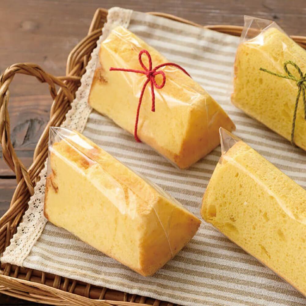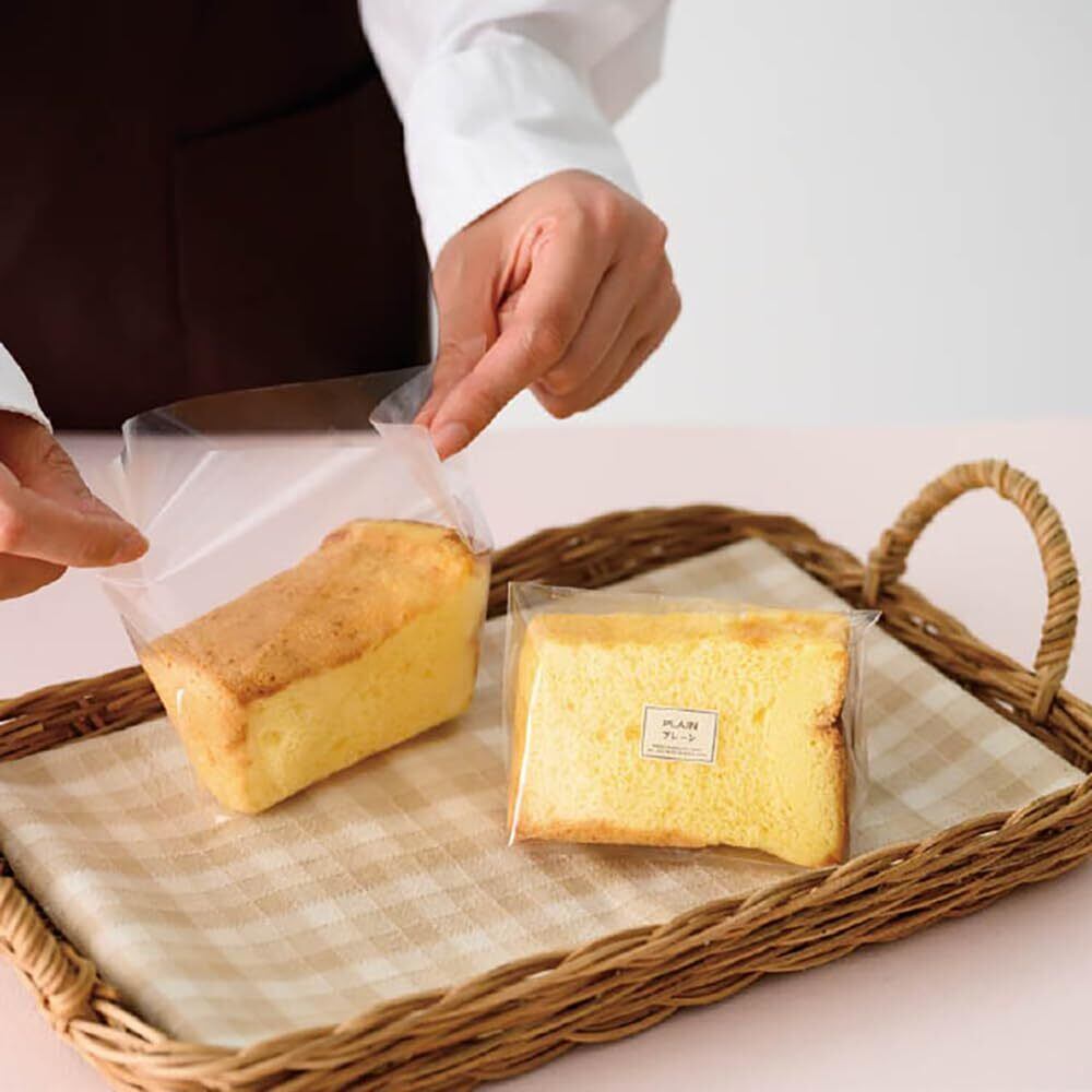 カットしたシフォンケーキ用の台形OPP袋です。直径18cm以下の型で焼き上げた、高さ9cm以下のシフォンにおすすめ。8等分にカットしてシフォンケーキが分厚くなっても対応できるように口が大きく開いています。1辺を留めるだけで完成するので、シート状のフィルムよりもカンタン・キレイに包むことができます。シールやリボンと合わせるのもおすすめです。