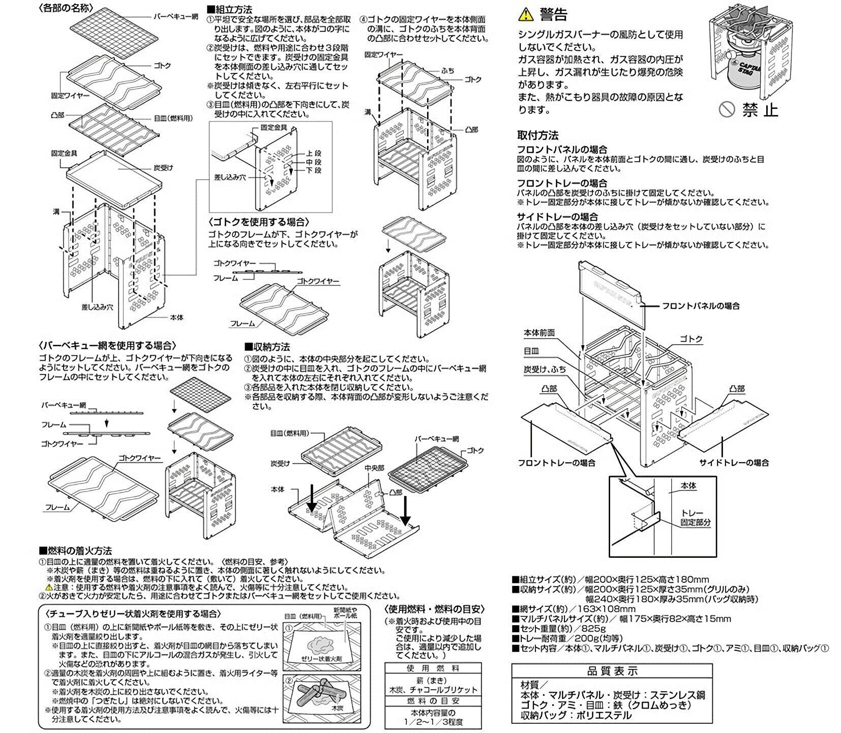 材質:本体・マルチパネル・炭受け/ステンレス鋼、ゴトク・アミ・目皿/鉄(クロムめっき)、収納バッグ/ポリエステル、原産国:中国