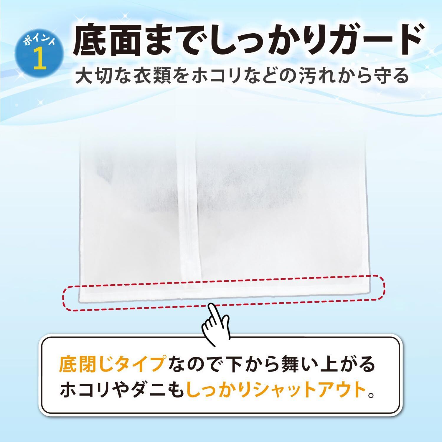 【ホコリなどの汚れから守る】:大切な衣類をホコリなどの汚れからガード。底閉じタイプなので下から舞い上がるホコリやダニもしっかりシャットアウト。