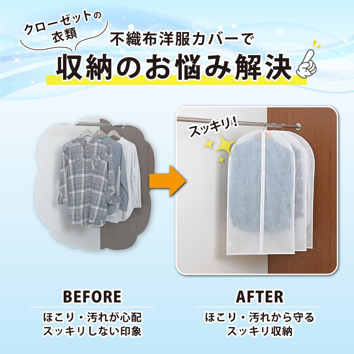 【クローゼット内スッキリ】:オフシーズンの大切な衣類を1枚ずつしっかり守れるカバー。