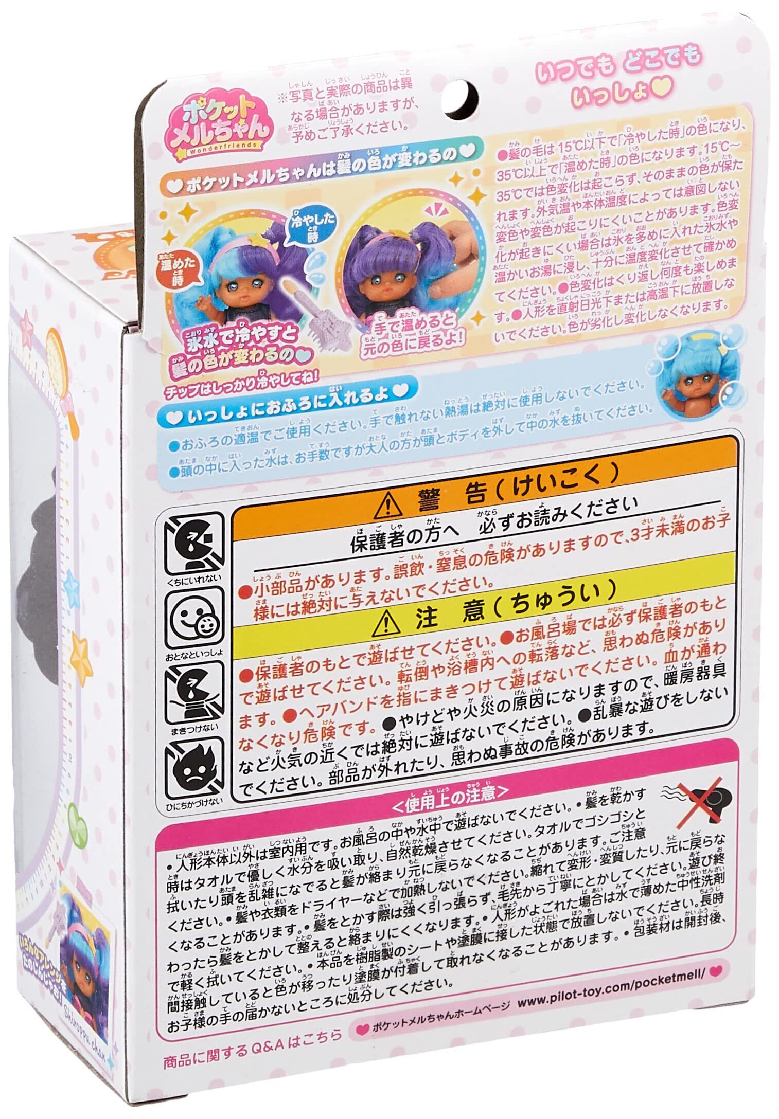 手のひらサイズで、いつでもどこでもつれて遊べるポケットメルちゃんシリーズ。メルちゃんのおともだちシロップちゃんは氷水で冷やすと髪の色がライトブルーからパープルに変化するよ。手で温めると元の色に戻ります。