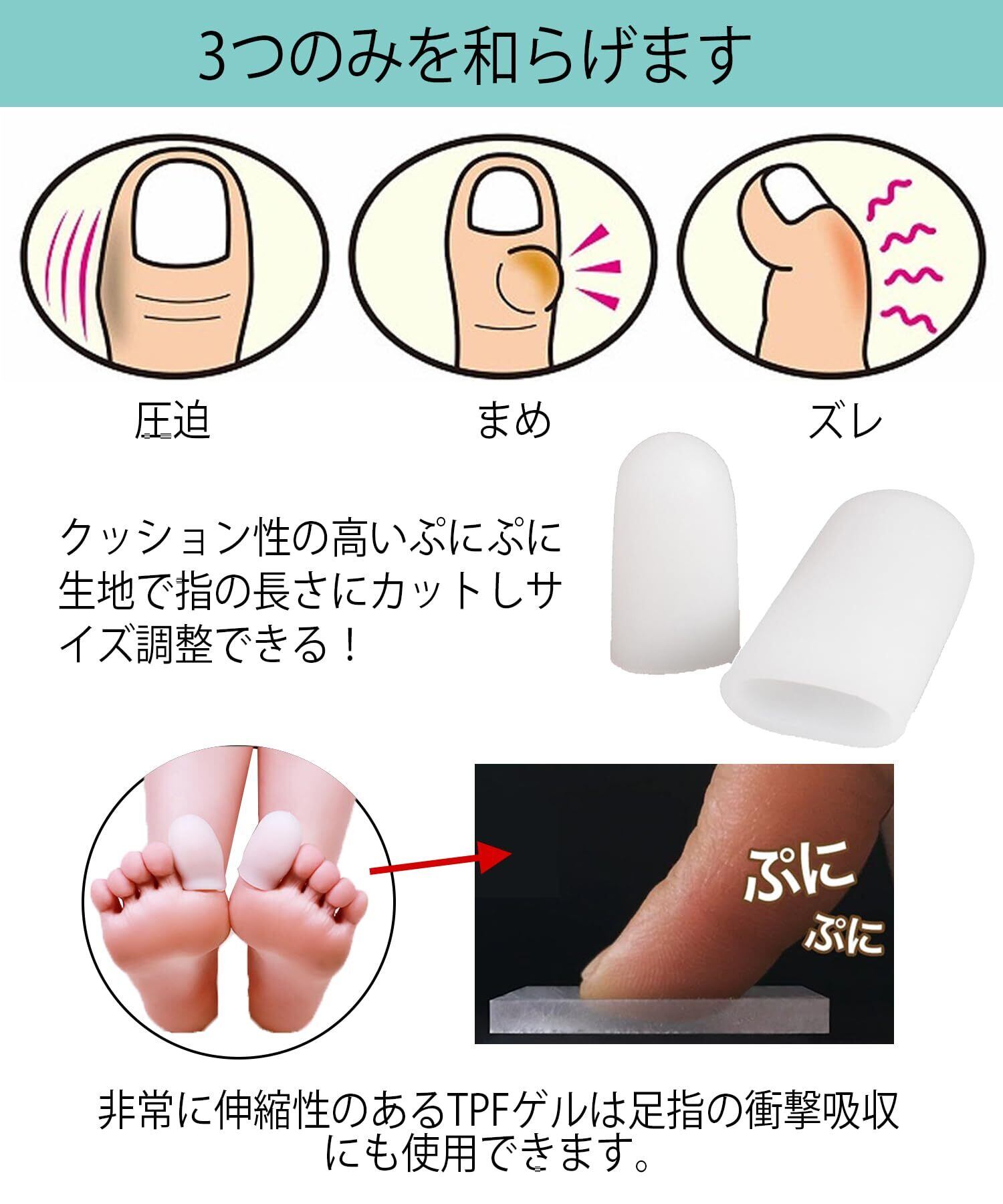 【柔らかくて快適】足の指先にかぶせて、巻き爪、爪の変形、ハンマートゥによるタコなどから優しくケアします。SEBS製で指をやさしく包み痛みから指、爪を保護します。
