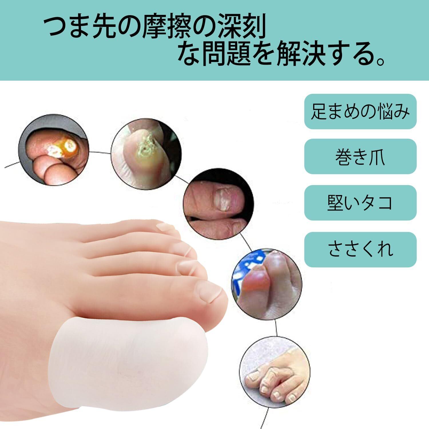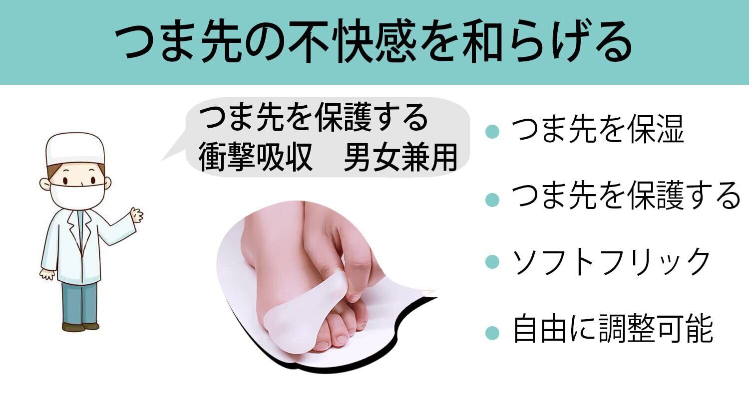 【通気性の良いメッシュデザイン】サックタイプにありがちな、蒸れを緩和するメッシュデザインでいつでも快適な着け心地を実現。 【柔らかいSEBS素材】肌に優しいSEBS素材なので安心して使用できます。さらに水洗い可能なので、常に清潔な状態を保つことが出来ます。 【柔らかくて快適】足の指先にかぶせて、巻き爪、爪の変形、ハンマートゥによるタコなどから優しくケアします。SEBS製で指をやさしく包み痛みから指、爪を保護します。 【調整が簡単です】はさみで簡単かつ便利にトリミングできます。彼らは男性と女性の両方のためになるでしょう、身体活動や他の日常業務の間にあなたのつま先を保護します。 【様々なシーンで大活躍】魚の目・たこ・まめ・巻き爪・ハンマートウなどの対策に効果的。スポーツにも適用し、マラソン、トライアスロン、アウトドアなど、長距離走のストレスから指、爪を保護します。