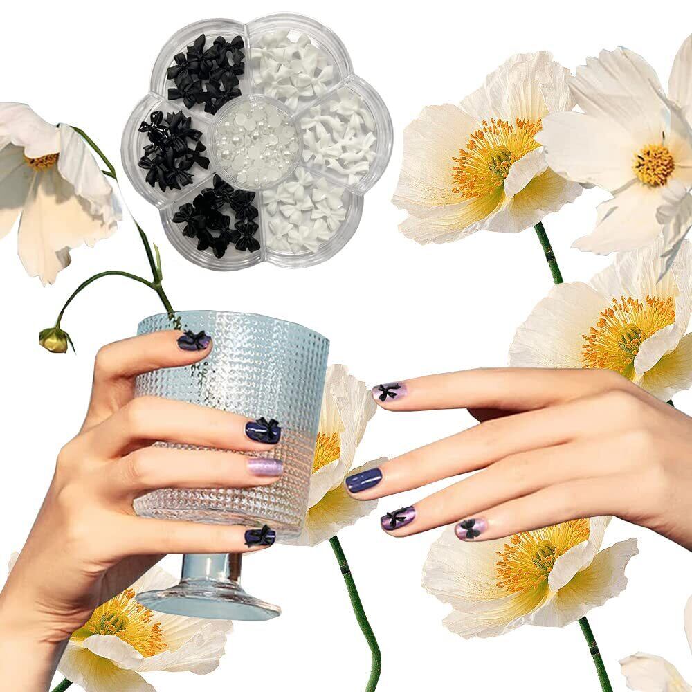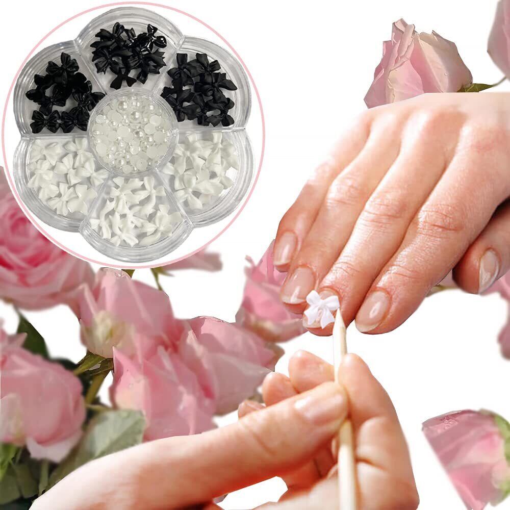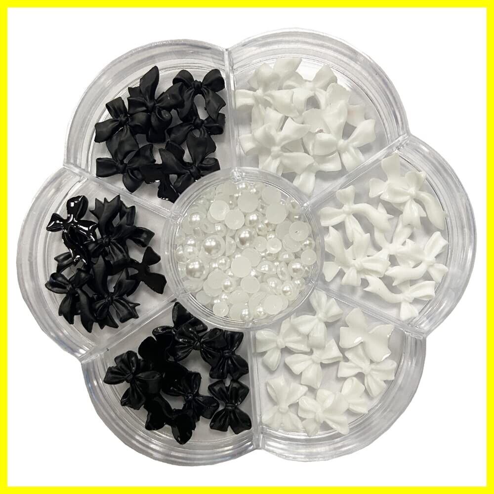 可愛いお洒落なリボン、半円パールが入っていたネイルパーツセットです、可愛いお洒落なリボンパーツ。定番の黒と白が3種類ずつ入っています。