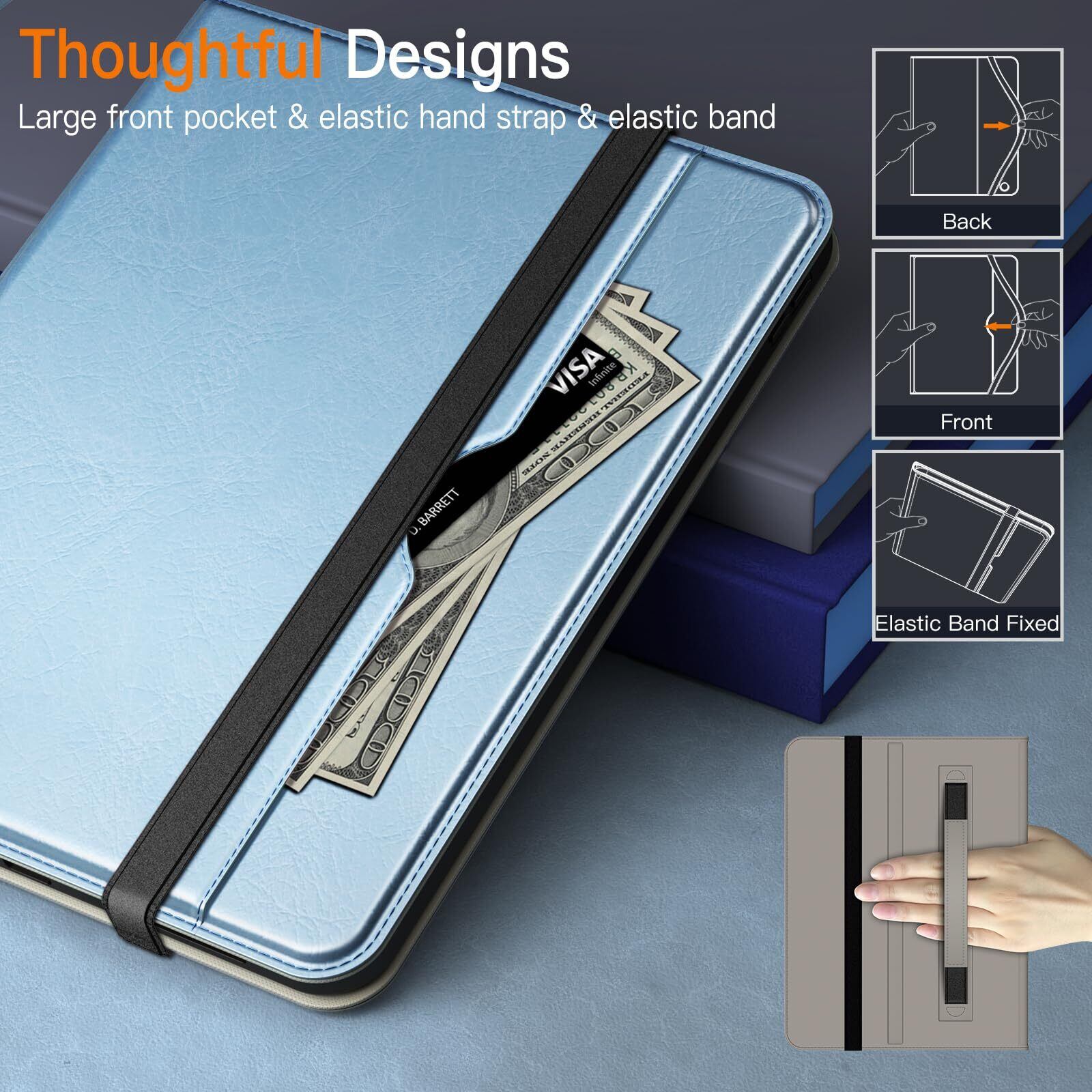 [多機能] カード、現金、メモなどを収納できる大きなフロントポケット。また、iPadをケースにしっかりと固定するための外側の伸縮性のあるストラップが付属しており、調節可能な内側のハンドストラップはiPadをしっかりと保持するのに役立ちます