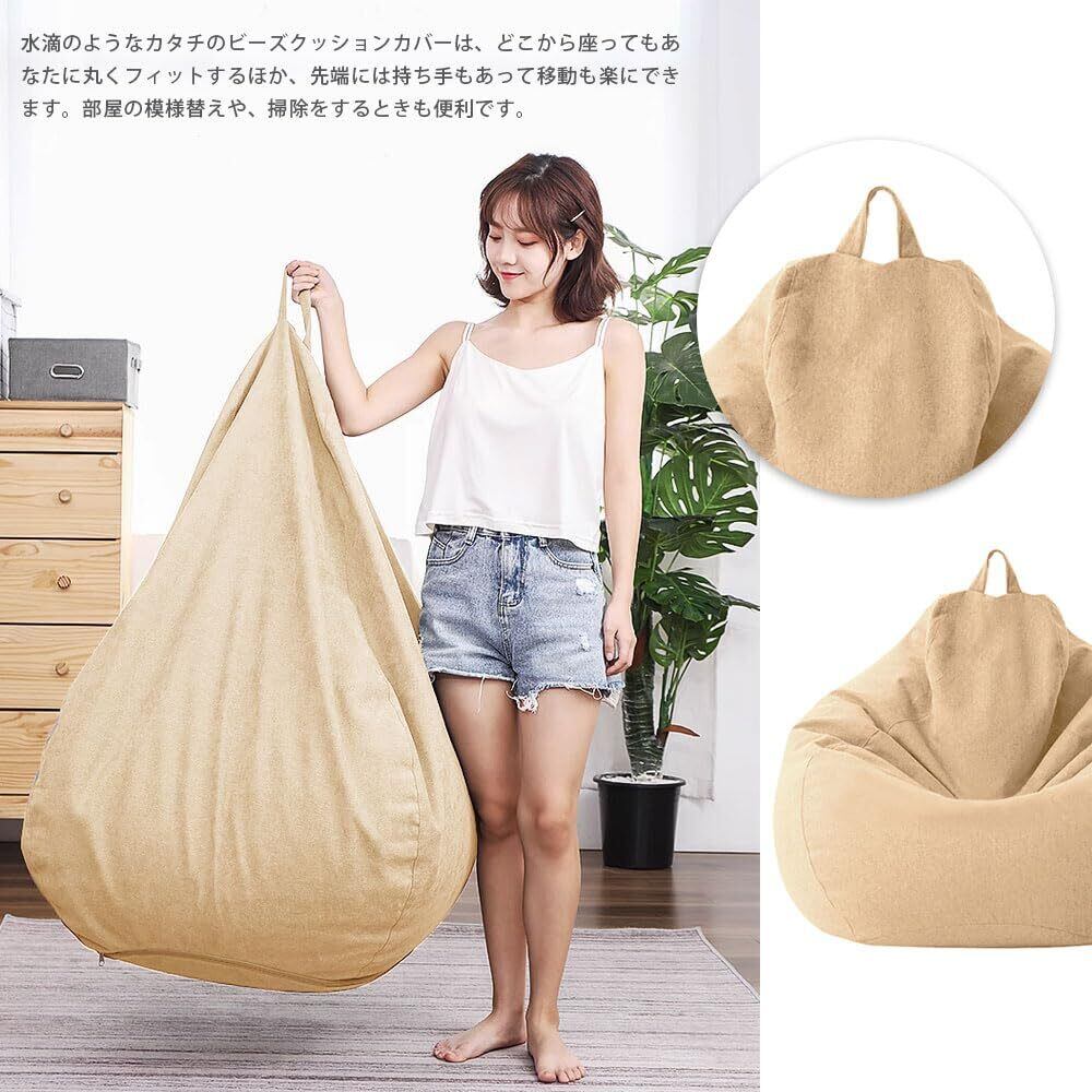 【持ち手ある】:水滴のようなカタチのビーズクッションカバーは、どこから座ってもあなたに丸くフィットするほか、先端には持ち手もあって移動も楽にできます。部屋の模様替えや、掃除をするときも便利です。