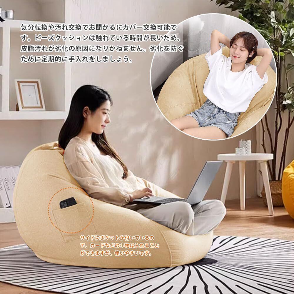 【ポケット付き】:サイドにポケットが付いているので、カードなどの小物は入れることができますが、使いやすいです。気分転換や汚れ交換でお聞かるにカバー交換可能です。ビーズクッションは触れている時間が長いため、皮脂汚れが劣化の原因になりかねません。劣化を防ぐために定期的に手入れをしましょう。