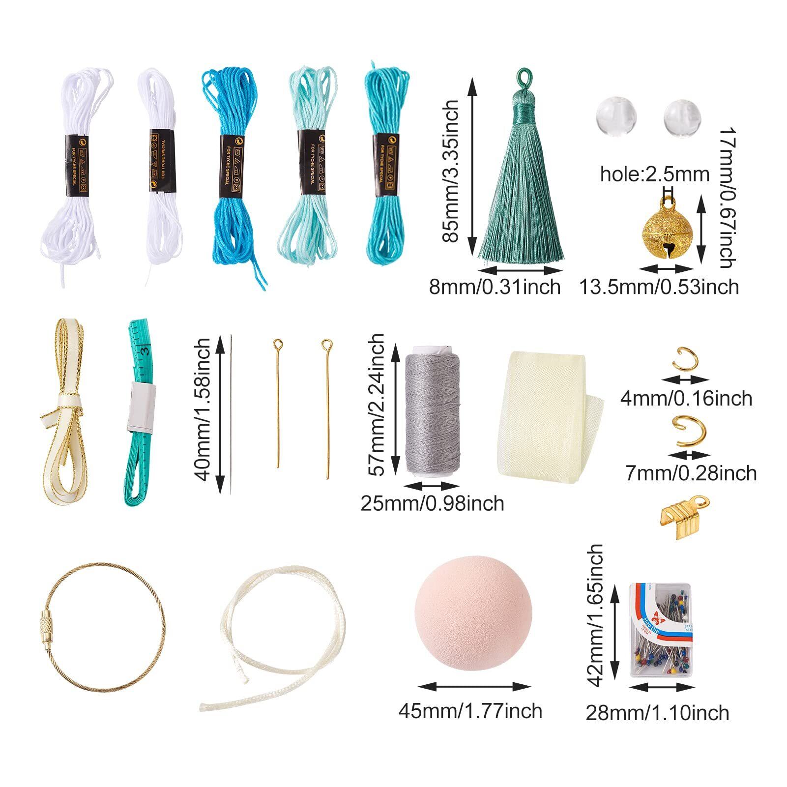 【パッケージ内容】:ラウンドボール*1個+ニードル*1箱+テープメジャー*1個+コットン糸*5束+ライン*1巻+オーガンジー1本+リボン1本+ロープ1本+タッセル*1個+鈴ベル*2個+針*1本+9ピン*4本+ビーズ*3個+丸カン*12個+リング金具*1個+エンド金具*2個+英語の説明書。