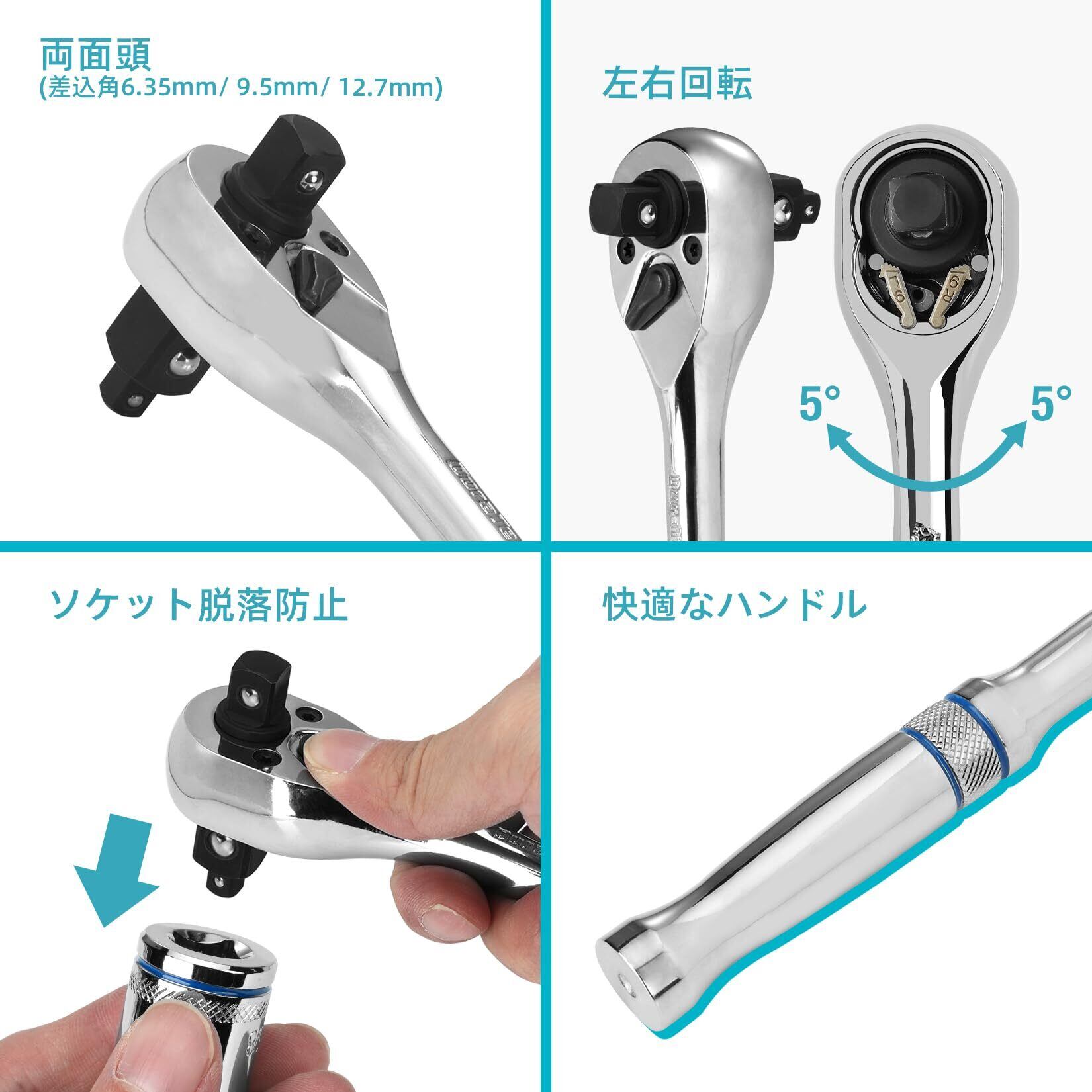 【こだわりの特徴】ラチェットレンチはクイックリリースのデザインで、ソケットの脱着はボタンを押すだけで簡単にできます。および72山ギアを採用しており、細やかな動きが可能で狭い場所での作業は抜群です。 ハンドルが3In1の設計と20PCまでのソケットが含まれて、この工具セット一つ揃えで、いろんな場面に対応できます。