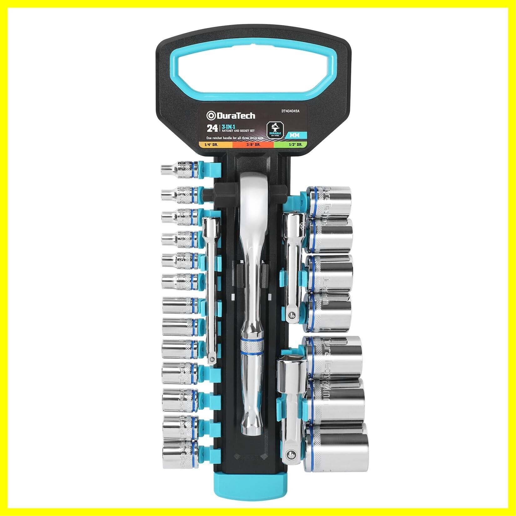 DURATECH ソケットレンチセット ラチェットレンチ 24点組 3in1 ラチェットハンドル 差込角6.35mm 差込角9.5mm 差込角12.7mm エクステンションバー3点 ソケット20点 メンテナンス用 自動車 車 バイク 車いじり 整備工具 【収納ホルダー付き】