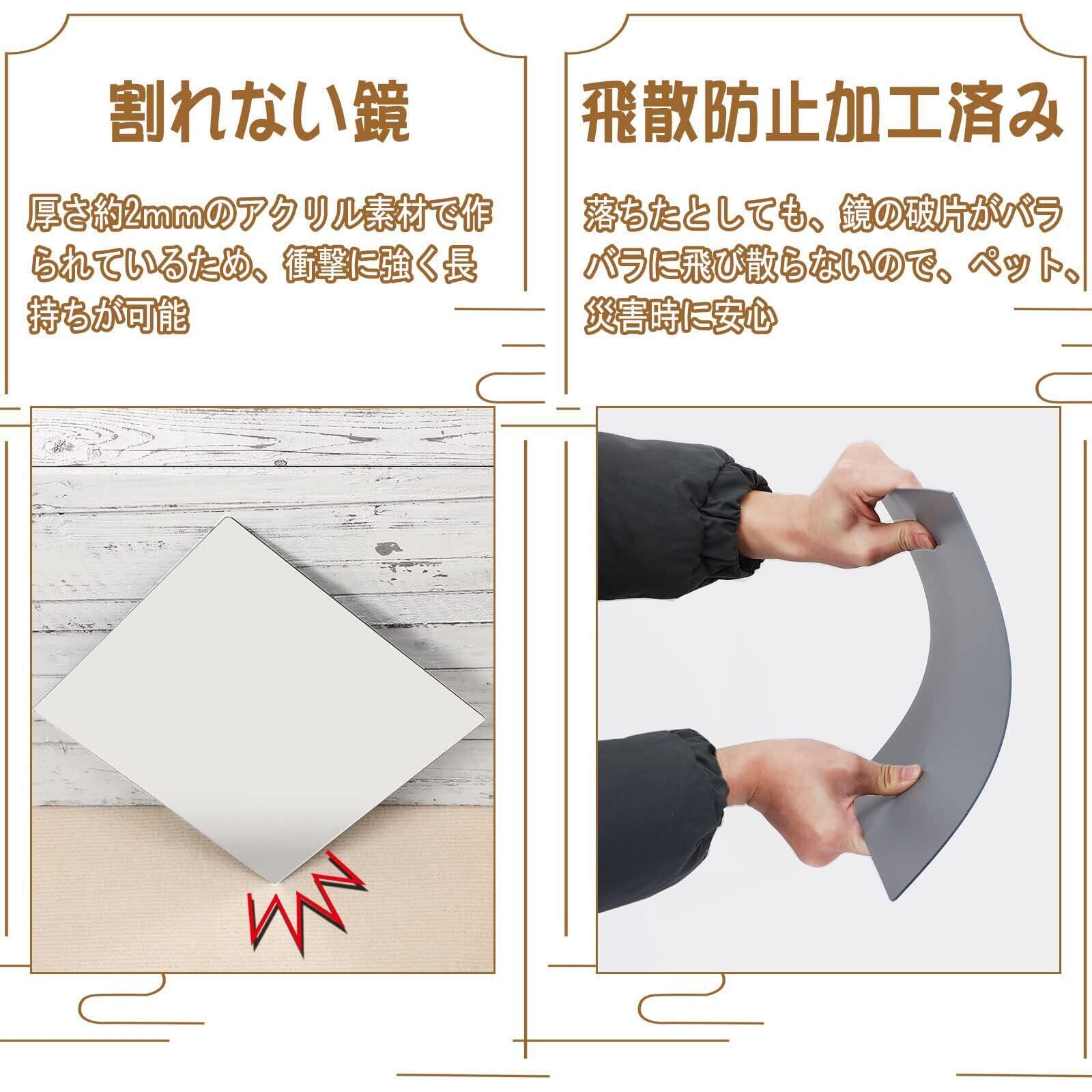 素材と工芸:鏡はいいアクリル素材で作られているので、ガラス製ミラーよりずいぶん軽くて、耐衝撃力が強くて、割れにくいです。さらに、飛散防止加工も角丸加工も施されており、万が一割れてしまっても鏡の破片による怪我しません。だから子供やペットがいる家庭でも利用できます