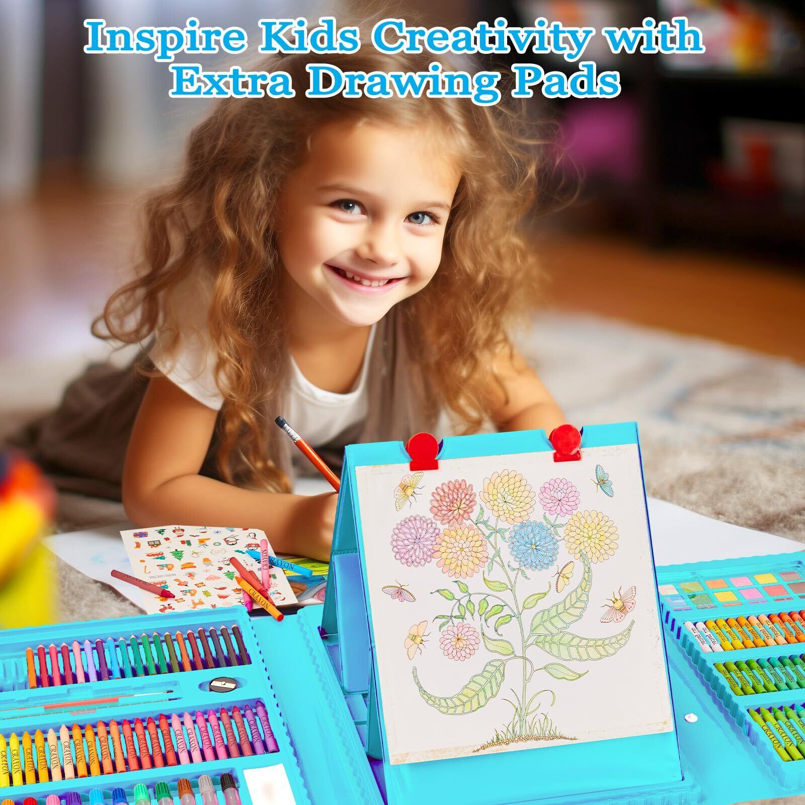 KINSPORY 290点 お絵描きセット 子供用 アートセット、両面イーゼル 水彩画 色鉛筆 絵の具 マーカー クレヨン セット、新進アーティスト向けの 学用品 画材 ケースギフトガールズボーイズキッズティーンズ 子供2人遊び用 (ブルー)