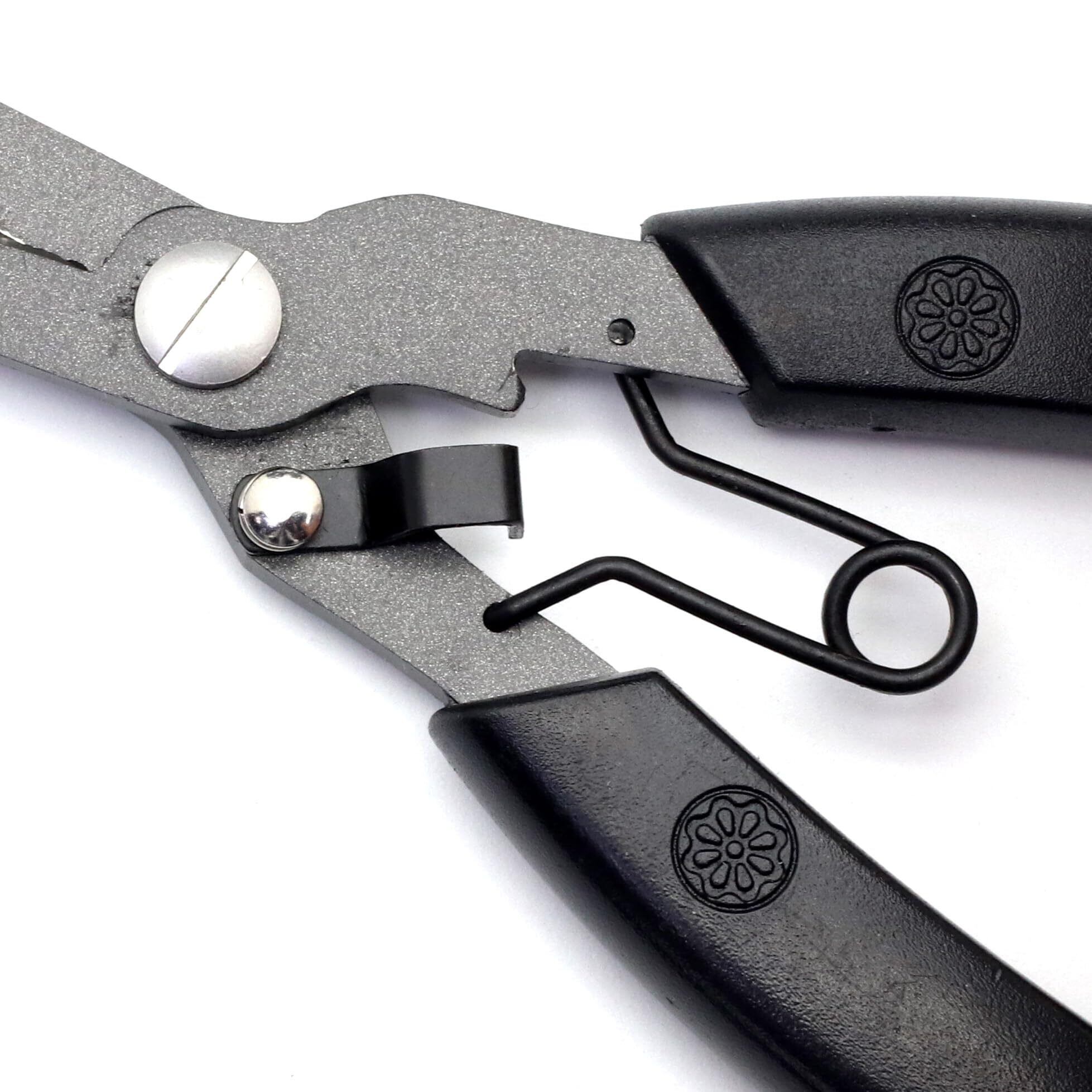 スプリットリングオープナー(#3-#6スプリットリング推奨)、ギザ刃ラインカッター(ナイロン・フロロ・PE対応)、片手で開閉可能なロック部、スリーブカシメ、エンドロープ・ランヤード取付穴